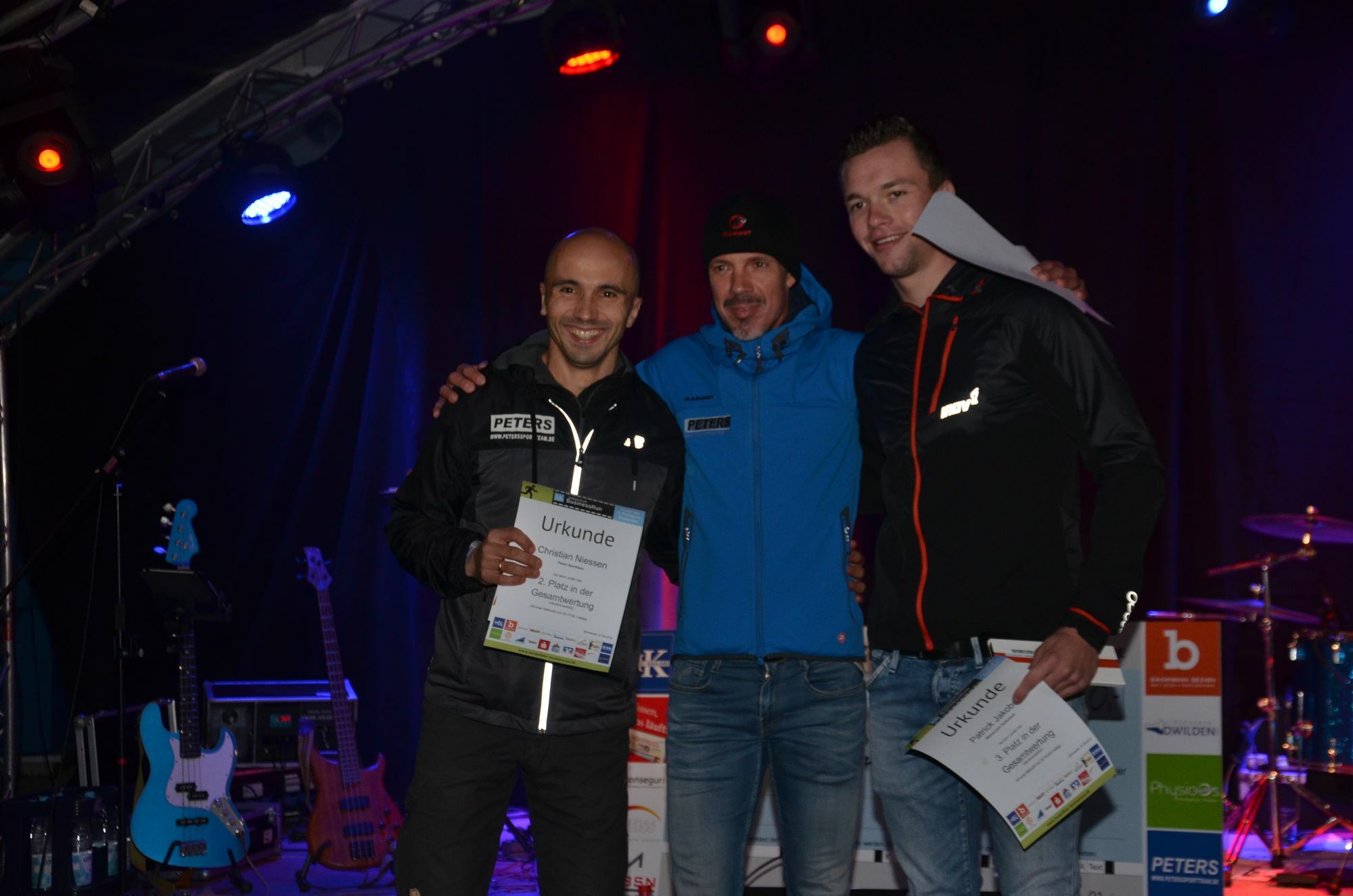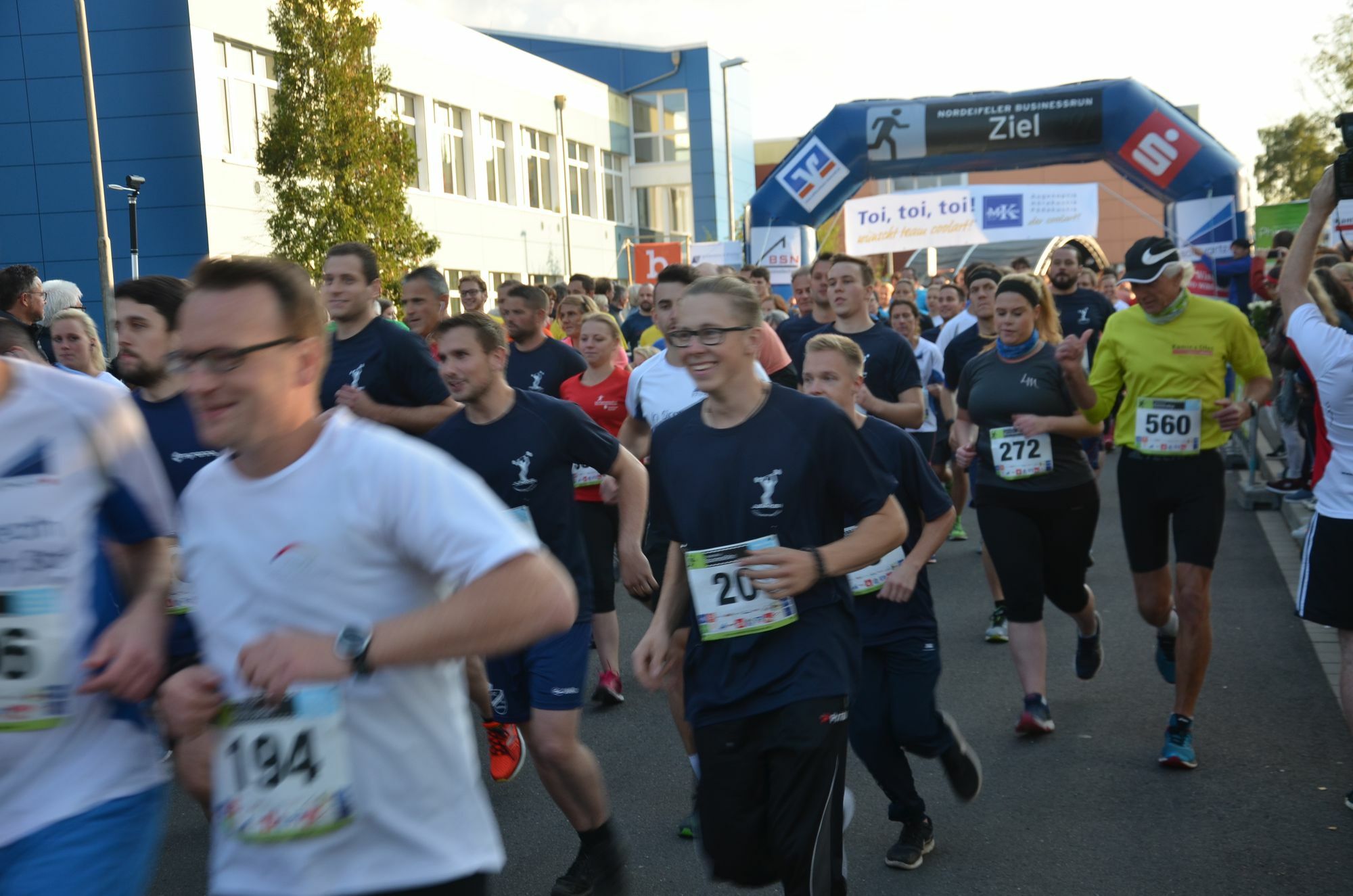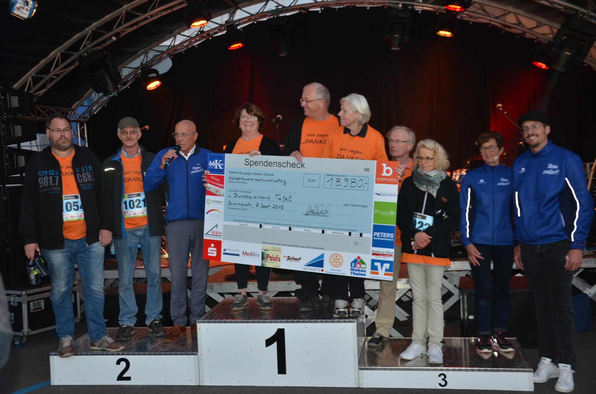Gleiches gelang Sonja Vernikov, die nach 18:41 Minuten das Ziel erreichte. Gemeinsam mit Gaby Andres und Uschi Arndt holte sie den Damentitel für den Skikeller Kaulard & Schroiff. Deren Chef, Stefan Schroiff, heimste Platz eins unter den Vorgesetzten ein - sein weibliches Pendant ist Esther Gombert von der Orthopädie Gombert. Die Titel als schnellste Azubis gingen an Patrick Jakobs (Gesamtplatz drei) vom Wasserwerk Perlenbach und Alina Breidenich von der Schwartz GmbH. Schnellste Walker waren in diesem Jahr Seriensiegerin Birgit Bauer (Steuerbüro Horst Schmitz) und Bernhard Pauls (Gebr. Pauls oHG). Ein Einstand nach Maß feierte die Otto Junker GmbH: Erstmals für den Nordeifeler Businessrun gemeldet wurden sie als Team mit den meisten Teilnehmern gewertet. Die Sportler waren nicht nur in stattlicher Zahl von 85 Athleten angetreten, sondern hatten auch noch eine Fahne dabei, die den Weg zum Unternehmen aus Lammersdorf wies. Dass es beim Nordeifeler Businessrun nicht nur um Sport und Spaß geht unterstrich Initiator Matthias Kaulard nach dem Lauf, als er den Erlös des Events aus dem Vorjahr an die Monschauer Tafel überreichte: Stolze 18.980 Euro waren zusammengekommen.