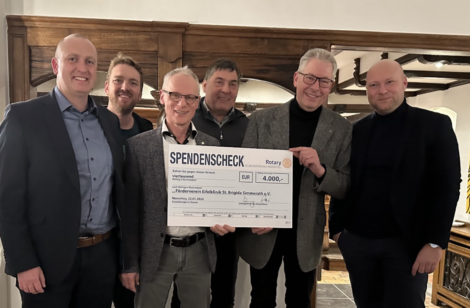 Der Präsident des Rotary Clubs Monschau – Nordeifel, Thomas Zehnpfennig, bedankte sich für die informativen Vorträge und überreichte Karl-Heinz Hermanns dann einen symbolischen Scheck über 4000 €. Vorsitzender Hermanns und stellv. Vorsitzender Martin Krings bedankten sich für den Förderverein herzlich für diese bedeutende Spende, die der Förderverein als Anteilsfinanzierung in die Anschaffung von kingerechtem Mobiliar und Spielmaterial auf den Fluren der Eifelklinik einbringen wird.