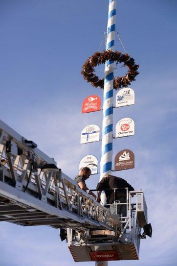 Die Zeit der Maibäume ist zwar längst schon vorbei, doch in der Wilhelmstraße stand der weiß-blaue Gigant im Mittelpunkt des Geschehens. Zahlreiche Besucher hatten sich eingefunden, um nach echt »bayerischer Art« mit den »Stub’n-Chefs« Markus Schwarzmüller und Petra Gerardy eine zünftige Gaudi vom Stapel zu lassen. Auf dern Dorfplätzen in Bayern thronen Maibäume aller Größen, herrlich dekoriert mit bunten Bändern und vielseitigen Schildern, auf denen ortsansässige Firmen Werbung betreiben. Was für Bayern gut ist, kann für Roetgen nicht schlecht sein, dachten sich Schwarzmüller und Gerardy. Gedacht – getan: Ein erster Schritt in die richtige »bayerische Richtung« (Schwarzmüller ist ein echter Bajuware) wurde in Roetgen vollzogen. Für Bürgermeister Jorma Klauss ist das alles eine große Bereicherung für Roetgen, was in der Wilhelmstraße bisher geschaffen wurde. Die neuerliche Aktion mache deutlich, wie gut das Gemeindeleben funktioniere. »Das zeichnet uns aus, darauf können wir stolz sein«, hob der Bürgermeister hervor. In einer großangelegten Aktion fand das Spektakel bei herrlichem Herbstwetter im Freien statt. Die große Drehleiter der Roetgener »Floriansjünger« musste Schwerstarbeit verrichten, galt es doch, in schwindelnder Höhe dem Maibaum zwölf Firmenschilder, handgemalt, mit eigenen Logos versehen, zu verpassen. Eine zeitaufwendige Sache, die nicht enden wollte. Die Reihenfolge der Anbringung wurde zuvor ausgelost. Streng nach bayerischer Ordnung. Petra Gerardy erzählte die Idee zu dieser typisch bayerischen Geschichte, die am Ende gut ausgeht und auch noch einen sozialen Aspekt aufweist. Die Firmen mussten für ihre Schilder zahlen, ergo kam ein schöner Batzen Geld zusammen. »Den haben wir nun den fünf in Roetgen ansässigen Kindergärten zur Verfügung gestellt«, so »Stub’n-Chefin« Gerardy stolz. Die Vertreter der Einrichtungen nahm einen großen Scheck in Höhe von je 450 Euro in Empfang. Freude bei den Empfängern, die an diesem Nachmittag lange ausharren mussten, ehe sich der Geldsegen über sie ergoss. Aber eine lohnenswerte Angelegenheit.