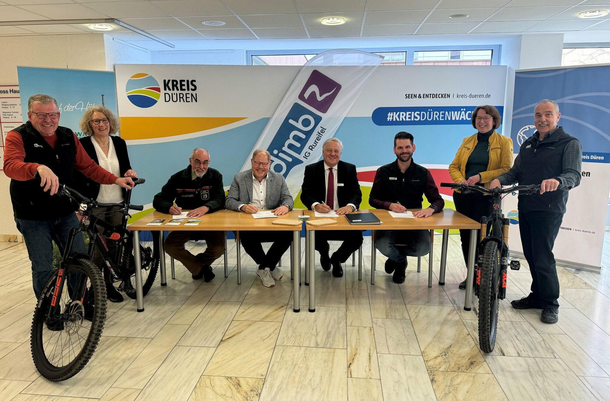 Simonskall. Gemeinsam mit dem Kreis Düren, dem Regionalforstamt Rureifel-Jülicher Börde und der Gemeinde Hürtgenwald wird der Verein Deutsche Initiative Mountainbike (DIMB) dafür sorgen, dass Mountainbiker ein attraktives Streckenangebot für ihren Sport nutzen können. Im Kreishaus unterzeichneten die Beteiligten den gemeinsamen Vertrag, mit dem einige Neuerungen auf dem Parcours zwischen Vossenacker Gymnasium und Simonskall einhergehen.