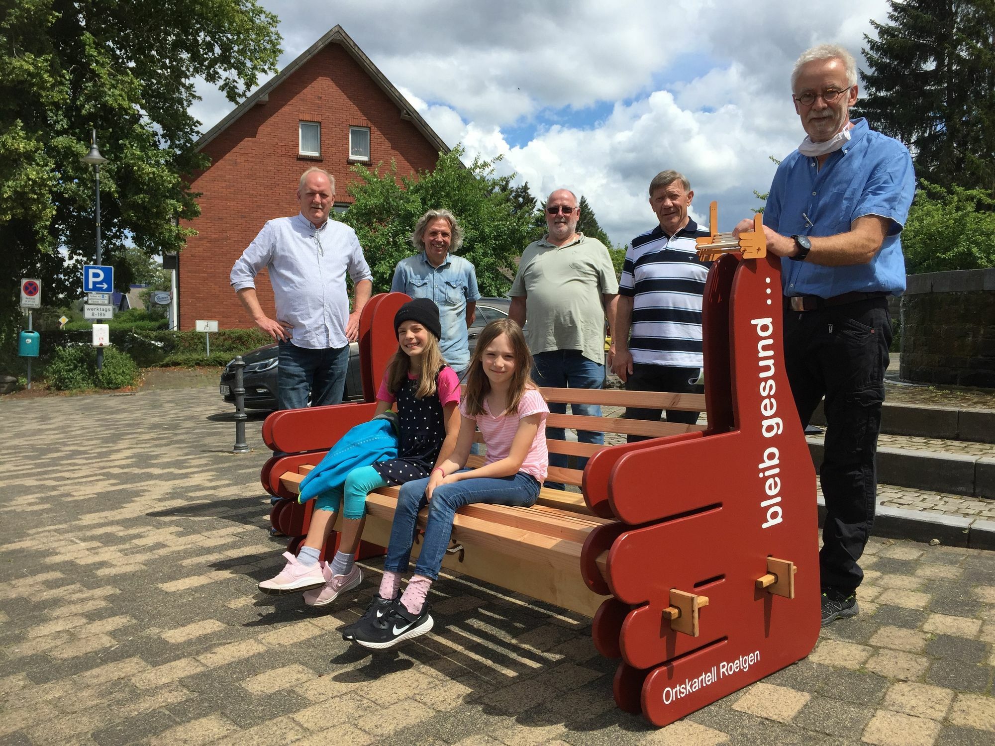 Anfang des Jahres kam dem Architekten Markus Leuschen aus Roetgen die Idee, eine individuelle Mitfahrbank für Roetgen zu entwickeln. Daher gestaltete der Designer eine Mitfahrbank in Form einer überdimensionalen Hand mit ausgestrecktem Daumen. Die Bank sollte ein Hingucker sein und so auch touristisch unterstützen. Aber dann kam Corona, und es gab andere Probleme. Ein YouTube-Video, das der TV Roetgen unter der Leitung von Laurin Melms in der Lockdown-Phase veröffentlichte, endete mit einer ermutigenden Daumen-hoch-Geste des Ortskartells Roetgen. Das gab den Anstoß zu einer neuen Idee. Kurz entschlossen erklärten sich einige Mitglieder des Ortskartells bereit, eine „Corona-bleib-gesund-Bank« zu bauen, die dem Design der Mitfahrbank nachempfunden sein sollte. Innerhalb einer Woche wurde diese Idee umgesetzt und die Bank konnte Ihrer Bestimmung übergeben werden. Die Grundidee war, diese in Form einer „Wanderbank“ an verschiedenen Punkten aufzustellen und so einer breiten Nutzung zu übergeben. Dies wurd nun in die Tat umgesetzt und als erster Standpunkt der Marktplatz im Zentrum Roetgens ausgewählt. Das Ortskartell Roetgen wünscht den Nutzern so: „bleibt gesund“ - verbunden mit der Hoffnung auf bessere Tage mit wieder möglichen Veranstaltungen, damit die sozialen Kontakte, wieder gepflegt werden können.