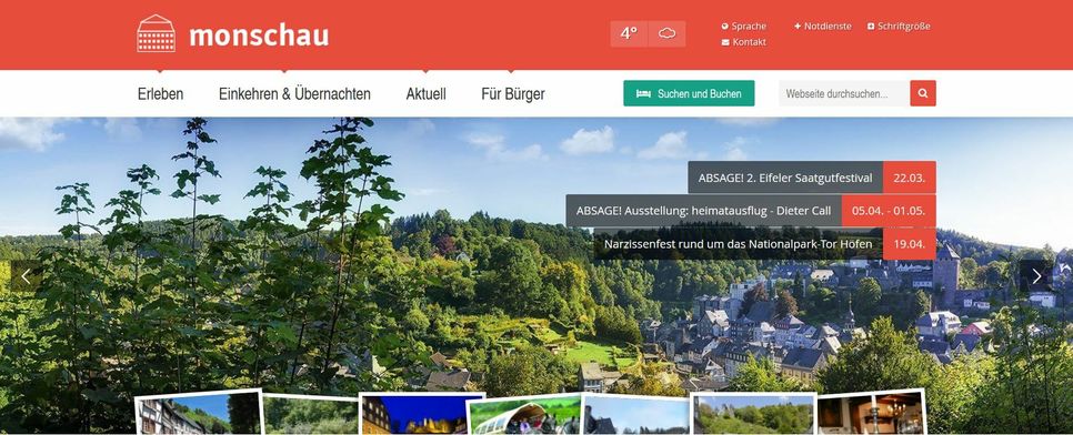 Die öffentlichen Einrichtungen wie Vennbad, Stadtbücherei, Nationalparktor Höfen, Touristinformation Monschau, der Betrieb der Musikschule , sind ab sofort für den Publikumsverkehr bis auf Weiteres geschlossen. Die telefonische Erreichbarkeit der Touristinformation, 02472-8048-0, sowie per Email: info@touristik.monschau.de, bleibt erhalten.