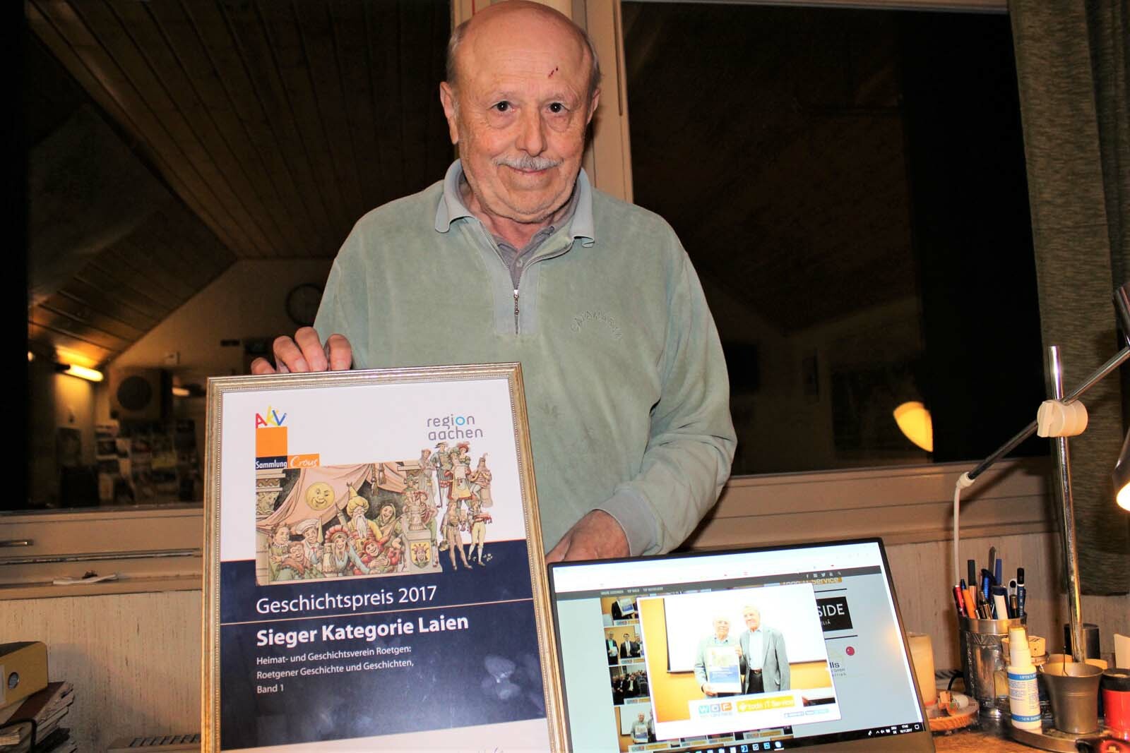 Die Region Aachen – Zweckverband sucht gemeinsam mit der AKV-Sammlung Helmu-A. Crous und dem historischen Institut der RWTH Aachen jährlich die beste Arbeit zur Geschichte der Region. 2016 hatten sich die Roetgener Heimatkundler erstmals beworben, jetzt gelang der große Wurf. Das Projekt habe besonders gut gefallen, weil hier eine ganz neue Form in Bezug auf Inhalt, Form, Struktur und Vertrieb gefunden wurde. Bodenständige und volkstümliche Themen werden behandelt, selbst die Geschichte des Aborts, des Kartoffelanbaus, Hausnamen, Straßen, einfache Wege, Brücken, Naturlandschaften, Unwetter, Hungersnöte, Mord- und Totschlag-Geschichten, Mäuse- und Rattenplagen, St. Martin, Kirmes und vieles mehr. Lobend auch die Anerkennung von Vorstand und Aachens Ex-OB Dr. Jürgen Linden: »Sie machen regionale Geschichte lebendig und schaffen damit ganz neue Perspektiven auf die Heimat für uns alle«.