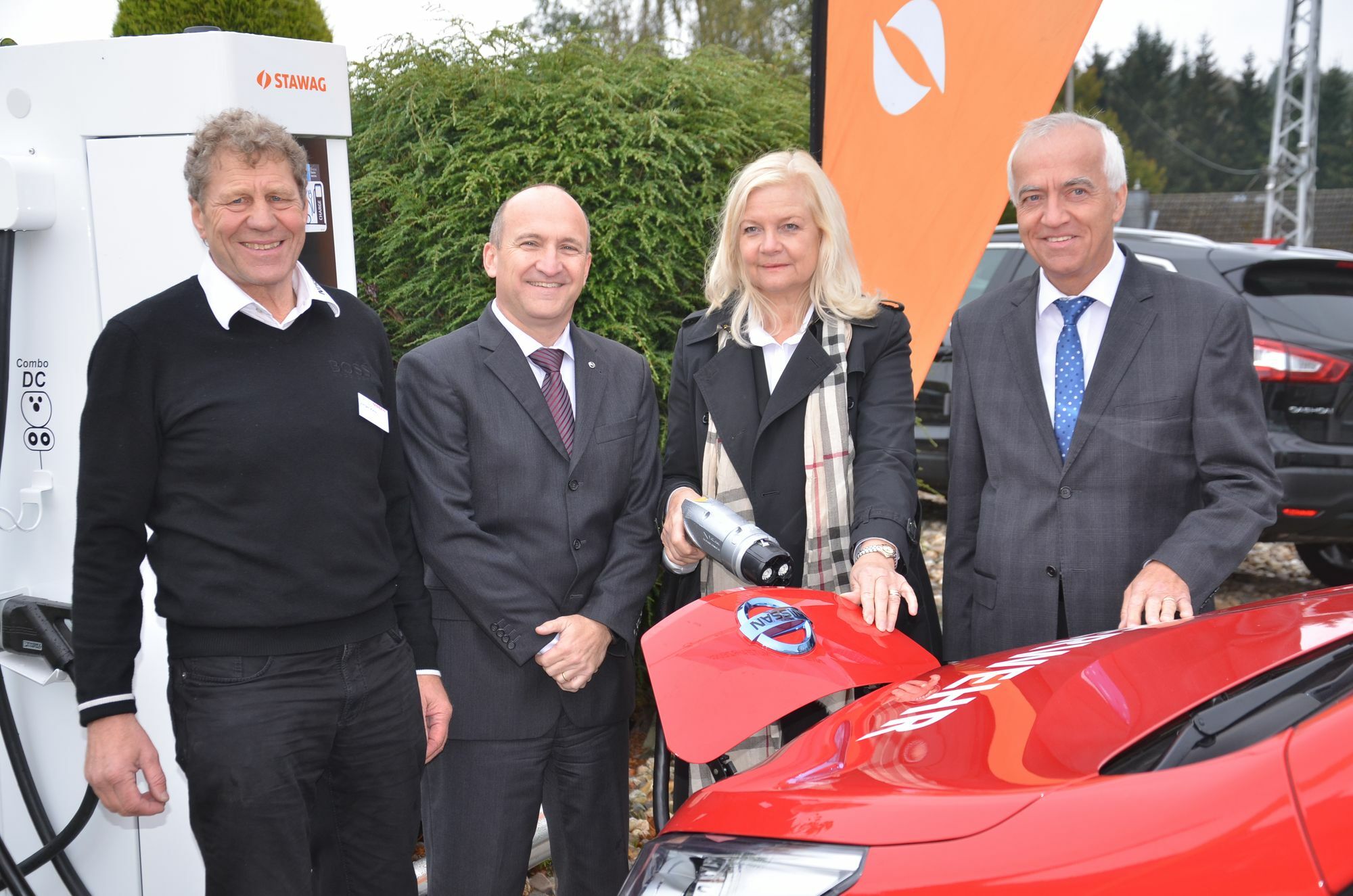 »In nur 20 Minuten kann man die Batterie seines Elektroautos für weitere 50 bis 70 Kilometer aufladen«, erklärt Hans-Jürgen Kirch. »Und mit einer Reichweite von 250 Kilometern schaffen unsere Autos mehr als alle anderen.« Man müsse so rasch wie möglich weg von fossilen Brennstoffen, erklärt Thomas Hausch, Geschäftsführer der Nissan-Center Europe GmbH, der eigens nach Höfen gereist war. Der »Nissan Leaf« sei der meistverkaufte Elektrowagen der Welt - fast 250.000 Mal sei er seit Dezember 2010 in Kundenhand übergegangen. »Das ist nicht nur das Verdienst umweltbewusster Autofahrer, sondern gerade auch engagierter Autohaus-Besitzer wie Hans-Jürgen Kirch«, zollt Hausch seinem Vertriebspartner großen Respekt. Deutschlandweit habe man einen Marktanteil von etwa 2 Prozent - Hans-Jürgen Kirch bringt es auf 10 Prozent. Die Stadt Monschau engagiert sich für eine zukunftsfähige Energieversorgung und möchte die Bürger für die Mobilität der Zukunft gewinnen. Für Bürgermeisterin Margareta Ritter war es daher eine Selbstverständlichkeit, bei der Inbetriebnahme der Ladestation dabei zu sein: »Wir leben in Einklang mit Natur und Umwelt. Elektrofahrzeuge sind dafür ideal - sie sind leise und emissionsfrei.« Sie lobte das Engagement der Familie Kirch und versicherte, dass man im Heckendorf Höfen die Ladezeit sehr gut überbrücken könne. Gefördert wird die neue Schnellladesäule auch von der Stawag. »Wir zahlen nicht nur allen Kunden, die ein Elektroauto anschaffen, 500 Euro Zuschuss, sondern unterstützen auch gerne unternehmerisches Engagement, wie das des Autohauses Kirch«, unterstreicht Dr. Peter Asmuth, Vorstand der Stawag. Und wirft ein neues Modell zum Speichern von Energie in den Raum. »Wenn alle Autofahrer nach Feierabend auftanken, wäre unser Stromnetz überlastet. Aber wenn die Menschen ihr Auto als Elektrospeicher nutzen und dann - natürlich gefördert - tanken, wenn viel Strom zur Verfügung steht, entsteht eine Win-Win-Situation«, so Asmuth.