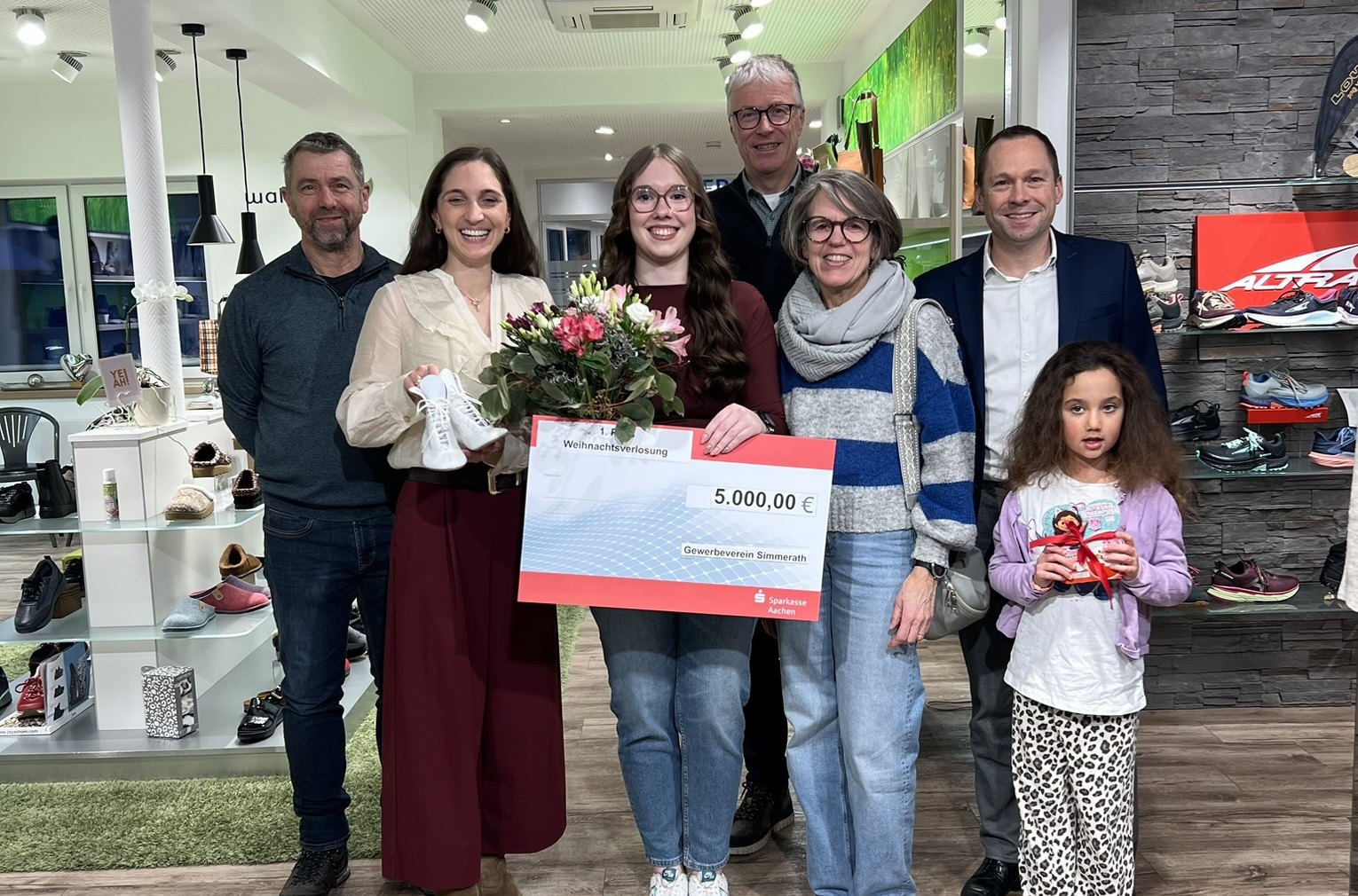 Simmerath (Fö). »Auf Instagram entdeckte ich reduzierte Tanzstiefel. Also bin ich zum Schuhhaus Hilgers, um ein Schnäppchen zu machen.« Wenig später hielt Marah Kell nicht nur neue Schuhe, sondern auch das Gewinnerlos der diesjährigen Simmerather Weihnachtsverlosung in der Hand. Der Tänzerin der Sonnenfunken-Prinzengarde wurde nun ein Scheck über 5000 Euro vom Gewerbeverein-Vorstand übergeben.