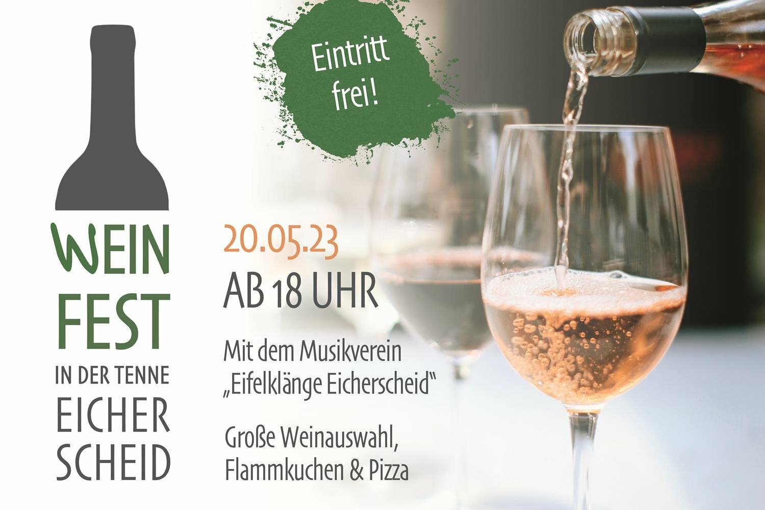 Größe, hölzerne Weinfässer – sogenannte Barriques - säumen als Stehtische die Tenne, die passend mit Reben dekoriert ist. Auch ein Biergarten ist eingerichtet, obwohl es gar kein Bier, sondern Weine vielfältigster Art zu trinken gibt. Natürlich ist auch ein alkoholfreies Angebot mit dabei. Dazu sorgt der Musikverein »Eifelklänge« Eicherscheid für zünftige Unterhaltung. Und zu späterer Stunde wird ein DJ für gute, begleitende Stimmung sorgen. Mit Flammkuchen und Pizza wird für das leibliche Wohl gesorgt. Und das alles bei freiem Eintritt.