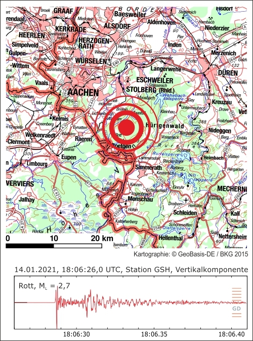 Am gestrigen Donnerstag, 14. Januar, ereignete sich um 19:06 Uhr MEZ (18.06 UTC) erneut ein leichtes Erdbeben zwischen Aachen und Roetgen. Das Beben wurde an allen seismologischen Messstationen des Landeserdbebendienstes deutlich registriert. Das Epizentrum lag in der Nähe von Rott, nördlich von Roetgen. Die Magnitude des Bebens betrug nach ersten Auswertungen 2,7 auf der Richterskala.