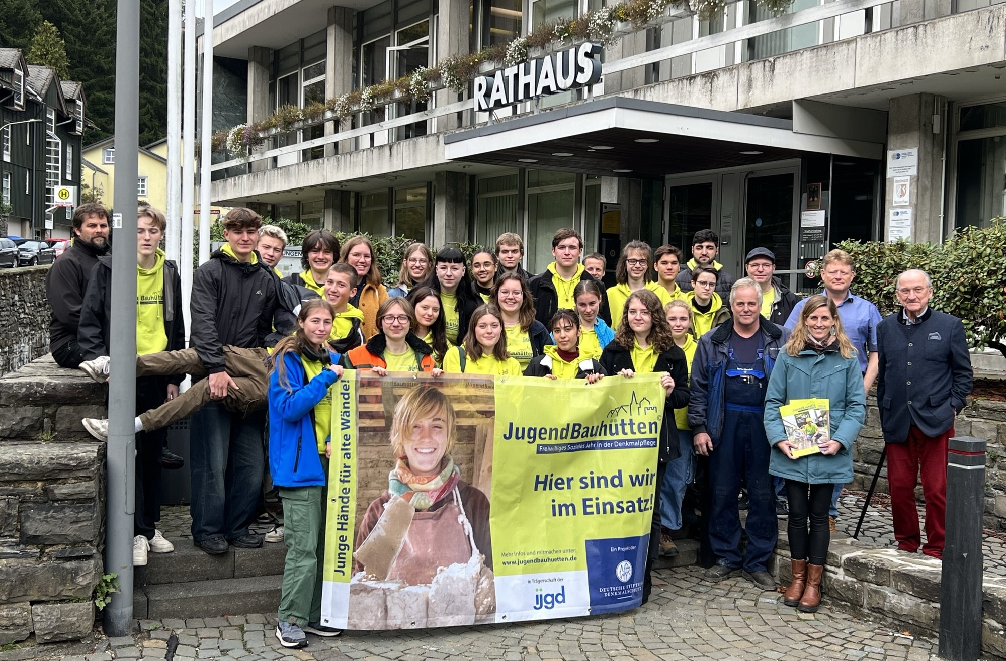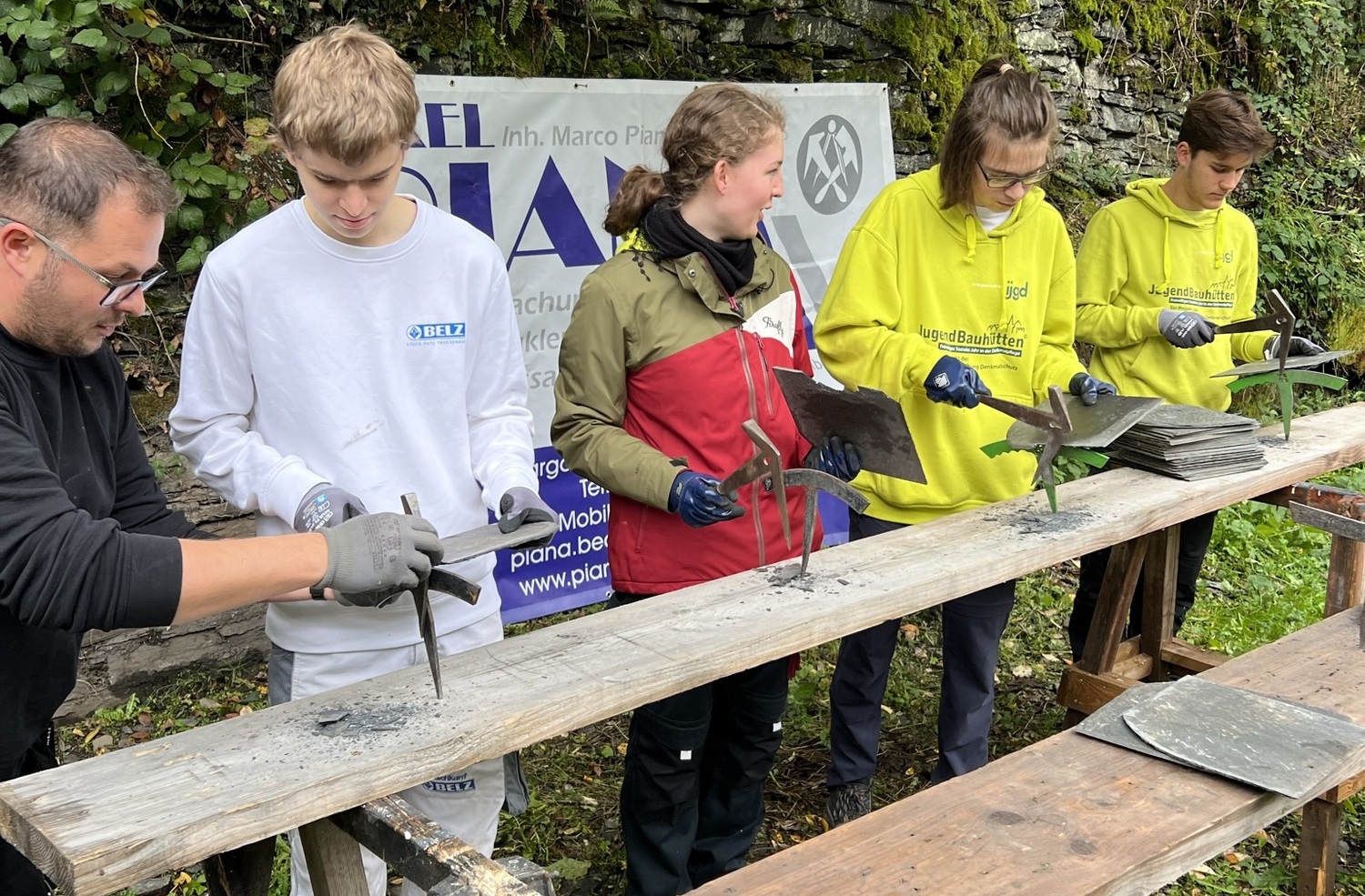 Monschau (Fö). Trockenmauern sanieren, Schiefer schlagen und damit ein Dach decken, Anstricharbeiten im Kolpinghaus durchführen oder kleine Metalldächer für Kreuze an der katholischen Kirche schmieden: Die Aufgaben sind vielfältig, denen sich 27 junge Menschen in diesen Tagen in der Monschauer Altstadt widmen. In Kooperation mit der Stadt Monschau und der ISG Monschau – Zukunft mit Geschichte e.V. macht die »ijgd – Jugendbauhütte NRW – Rheinland« im idyllischen Fackwerkstädtchen Station. An unterschiedlichen historischen Orten und denkmalgeschützten Objekten im Einsatz zu sein und an ihrem Erhalt mitzuwirken ist die Aufgeb. Dabei werden Freiwlligen etwas über handwerkliche Arbeiten an Denkmälern erfahren und den Erhalt des historischen Baubestands unterstützen. Beginnend Anfang September können Jugendliche von 16 bis 26 Jahren ein ganzes Jahr lang in einer der bundesweit 16 Jugendbauhütten traditionelle Handwerkstechniken erlernen, sie am Original anwenden und das Besondere des Echten und Authentischen mit eigenen Händen spüren und erfahren. In Monschau reicht die Spanne beim ersten Fachseminar für die Freiwilligen von der alten Wasserpumpe am Holzmarkt über das künftige Viertelhaus bis hin zur Erhaltung der Natursteinmauern am Rahmenberg. Dort werden unter Anleitung von Mitarbeitern des Bauhofs der Stadt Monschau die für das Stadtbild prägenden Mauern gesichert und instand-gesetzt. »Ein bedeutendes Relikt der Tuchmachergeschichte, das als Bodendenkmal ausgewiesen ist«, weiß Bürgermeisterin Dr. Carmen Krämer.