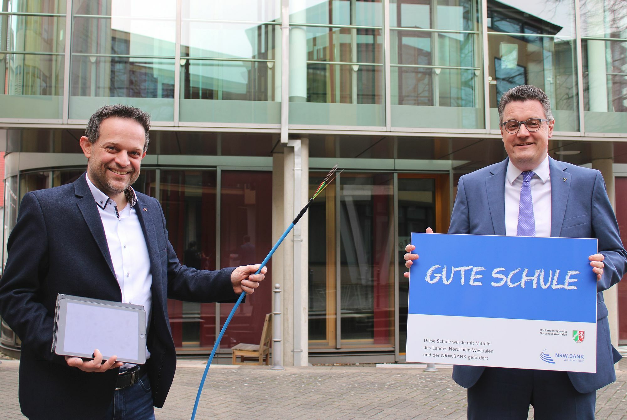Die StädteRegion Aachen ist Trägerin aller neun Berufskollegs an zehn Standorten auf ihrem Gebiet sowie von sieben Förderschulen, einer Schule für Kranke, der Abendrealschule und dem Weiterbildungskolleg. Das Geld fließt sowohl in die Verkabelungsarbeiten (Daten- und Lichtwellenkabel) als auch die aktiven Komponente (Switche) und die Endgeräte (z.B. interaktive Tafeln). »Bei der Digitalisierung an den Schulen handelt es sich um eine der wichtigsten Zukunftsaufgaben. Hier sind wir alle gefordert, die vielen guten und sinnvollen Fördertöpfe des Bundes und Landes für ganz konkrete Projekte vor Ort einzusetzen«, sagt Städteregionsrat Dr. Tim Grüttemeier. Das Immobilienmanagement hat schon früh in Zusammenarbeit mit der Schulverwaltung, den Schulen und dem IT-Dienstleister (regio iT) festgelegt, welche Standards eingehalten werden. So ist konkret der Netzwerkausbau auf 1.000 Mbit pro Sekunde und die Verlegung von Daten- und Lichtwellenkabeln nach neuestem Standard vorgesehen. Zudem wird ein flächendeckendes WLAN in allen Lehrräumen und Sporthallen sowie ein »Tafelmodul« (mit einem Anschluss für Präsentationstechnik) umgesetzt. Neben den infrastrukturellen Maßnahmen können alle Schulen im Rahmen ihrer Medienkonzepte in Absprache mit der Schulverwaltung Endgeräte besorgen. Das sind beispielsweise iPads, Laptops, Computer, oder Tablets. Auch Präsentationstechnik wie interaktive Tafeln, Beamer und Bildschirme und digitale Arbeitsgeräte wie 3D-Drucker, aber auch CNC-Fräsen können gefördert und beschafft werden. Das Gesamtvolumen hierfür liegt derzeit bei 1,5 Mio. € und wird aus den Fördermitteln getragen. Für die Endgeräte steht zusätzlich zu dieser Summe nun außerdem noch die Förderung aus dem Sofortausstattungsprogramm für die Schüler und Lehrkräfte zur Verfügung. Bis Mitte 2023 sollen alle Maßnahmen abgeschlossen sein.