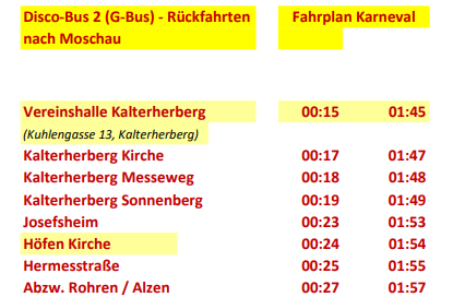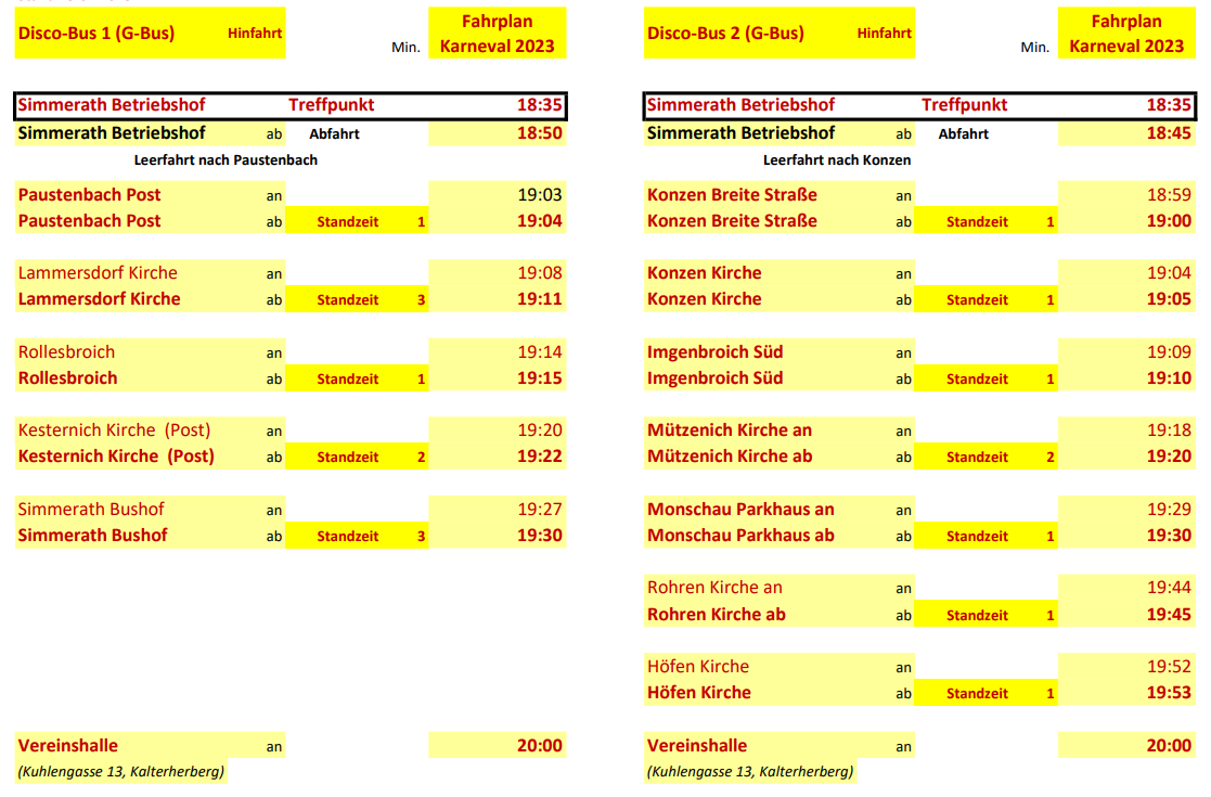 Zum Kostümbeatball in Kalterherberg am Karnevalssonntag, 19. Februar, sind die Discobusse der RVE im Einsatz. Zwei Busse bringen die Narren zur Veranstaltung. Start ist um 18.45 Uhr am Simmerather Betriebshof. Von dort geht es über Paustenbach, Lammersdorf, Rollesbroich und Kesternich wieder zum Simmerather Bushof und dann nach Kalterherberg. Die zweite Route führt über sämtliche Orte des Monschauer Stadtgebietes. Die Rückfahrten finden um 0.15 Uhr und 1.45 Uhr statt und führen in benannte Orte.