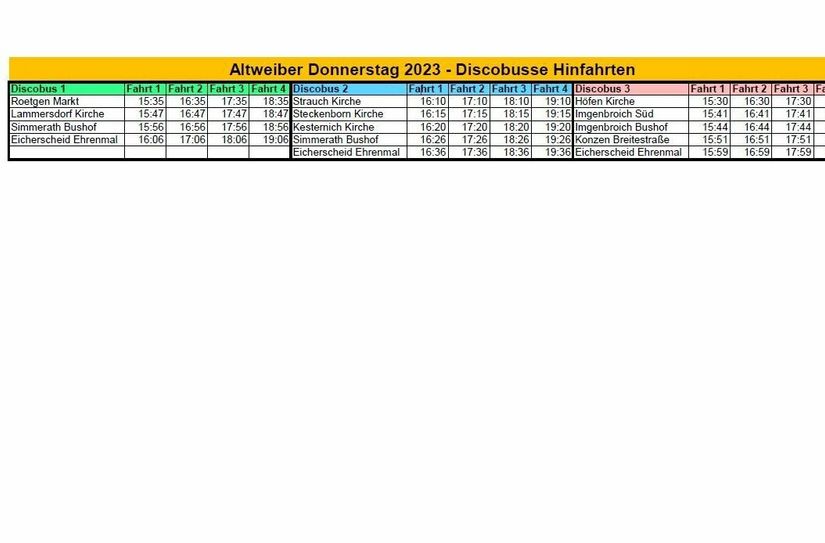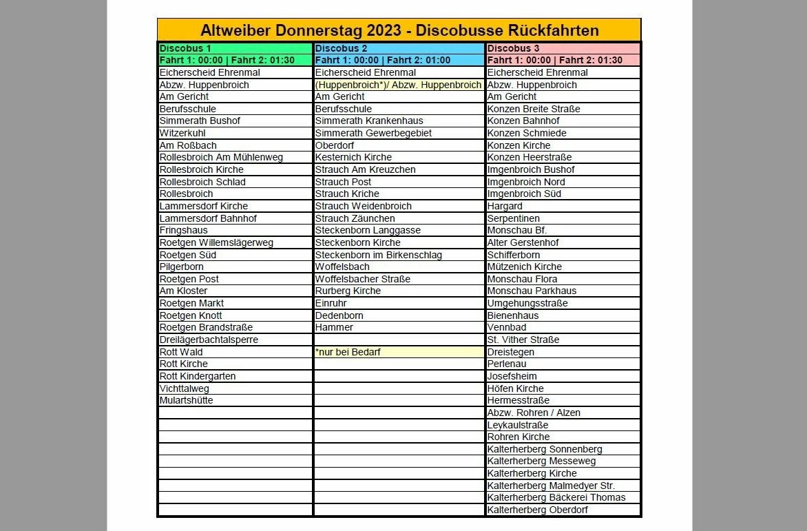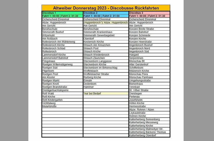 Am Altweiber-Donnerstag, 16. Februar, fahren Discobusse zwischen 15.30 und 19.30 Uhr auf drei Routen zur »Tenne«. Ein Bus führt von Roetgen über Lammersdorf und Simmerath, ein weiterer von Höfen über Imgenbroich und Konzen sowie ein Bus über Strauch, Steckenborn und Kesternich zur Vereinshalle nach Eicherscheid.