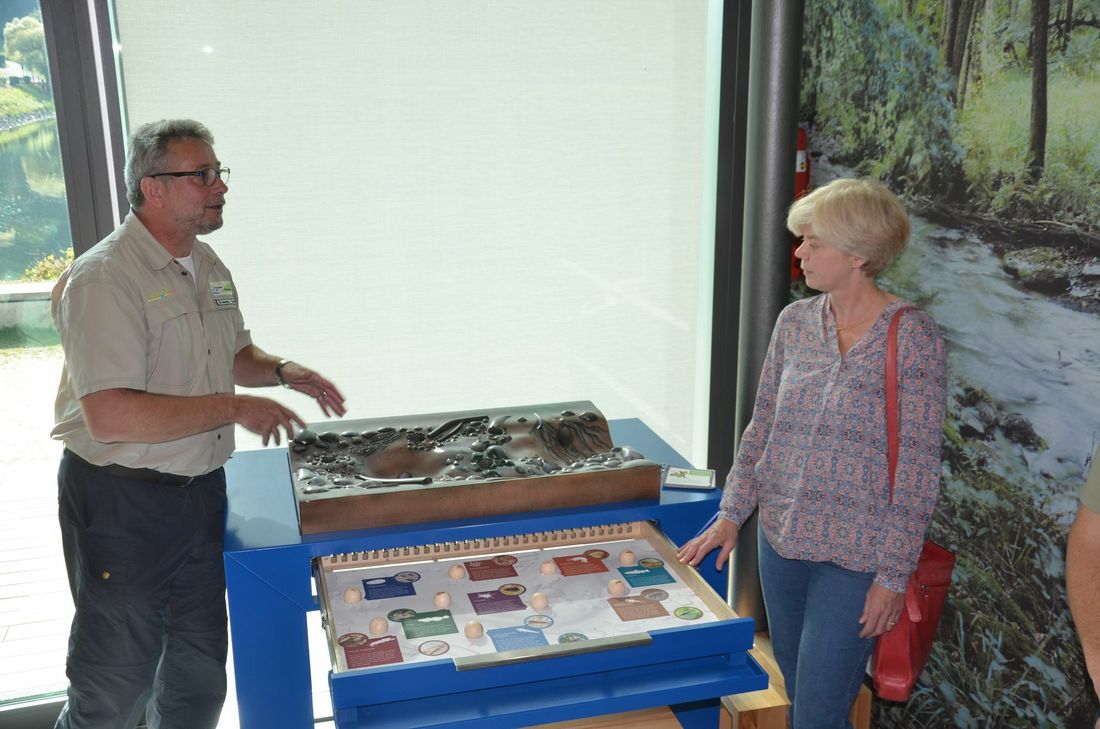 Absolutes Highlight des beliebtesten Anlaufpunktes für Touristen rund um den Nationalpark Eifel ist ein Biber, dessen Fell die Gäste anfassen und Konturen ertasten können. Eine Duft- und Akustikstation macht den Nager, der sich wieder in der Eifel ausbreitet, nachdem er noch in den 1970er Jahren als ausgestorben galt, mit allen Sinnen erlebbar. Mit knapp 100.000 Gästen im letzten Jahr stand in Rurberg das am besten besuchte Nationalpark-Tor. Seit 2005 kombiniert das Tor eine nationalparkspezifische Tourist-Info mit der Nationalparkausstellung »Lebensadern der Natur«. Die Ökologie der Still- und Fließgewässer wird optimiert und thematisch erweitert präsentiert. Unter Federführung von Tobias Wiesen und modelliert von Helmut Bergsch, wurden zahlreiche Tierexponate erstellt. »Besonders die Flussperlmuschel, über die auch ein neuer Film der Biologischen Station der Städteregion Aachen berichtet, legen wir den Besuchern ans Herz«, erklärt Wiesen. Ihm ist es auch zu verdanken, dass alle Informationen der Ausstellung in den vier Sprachen Deutsch, Englisch, Niederländisch und Französisch verfügbar sind. Via QR-Code können sie auf das Smartphone geladen und die gewünschte Sprache gewählt werden. Sehgeschädigte können sich die Texte auch vorlesen lassen.