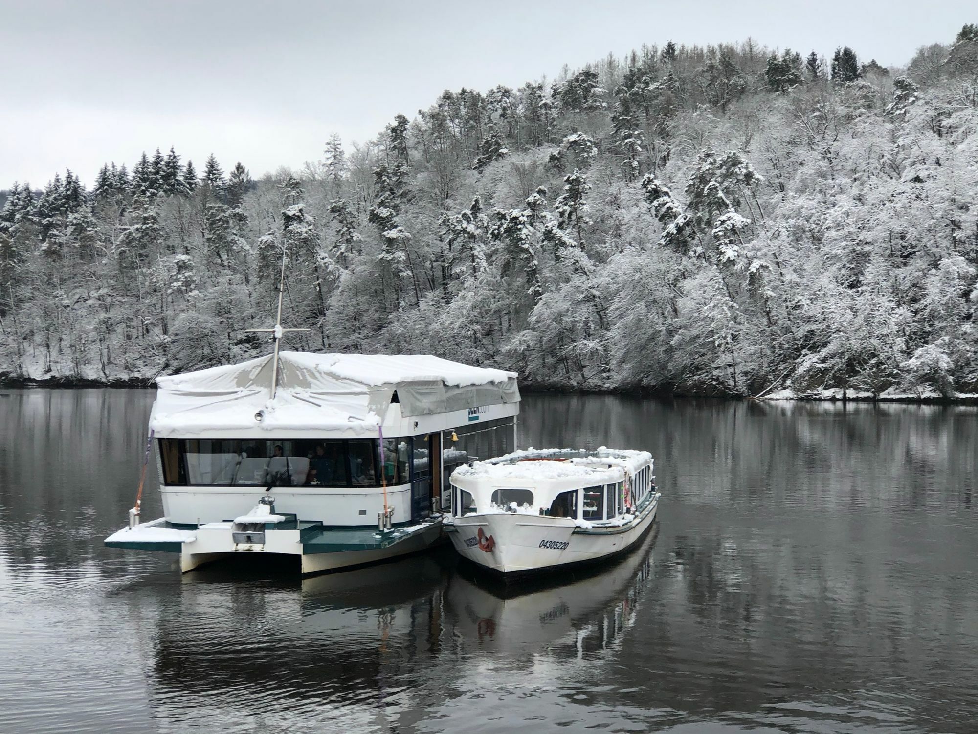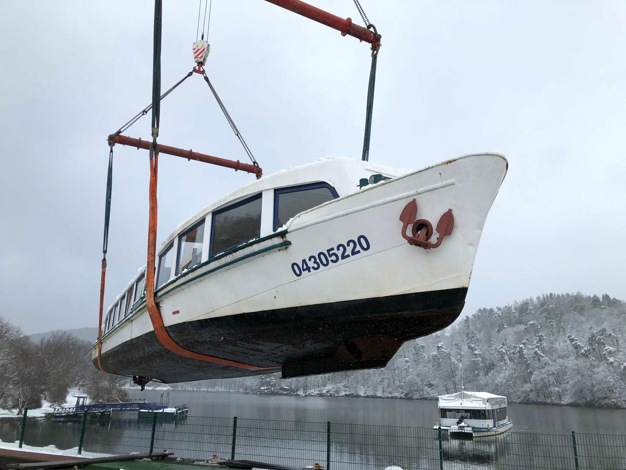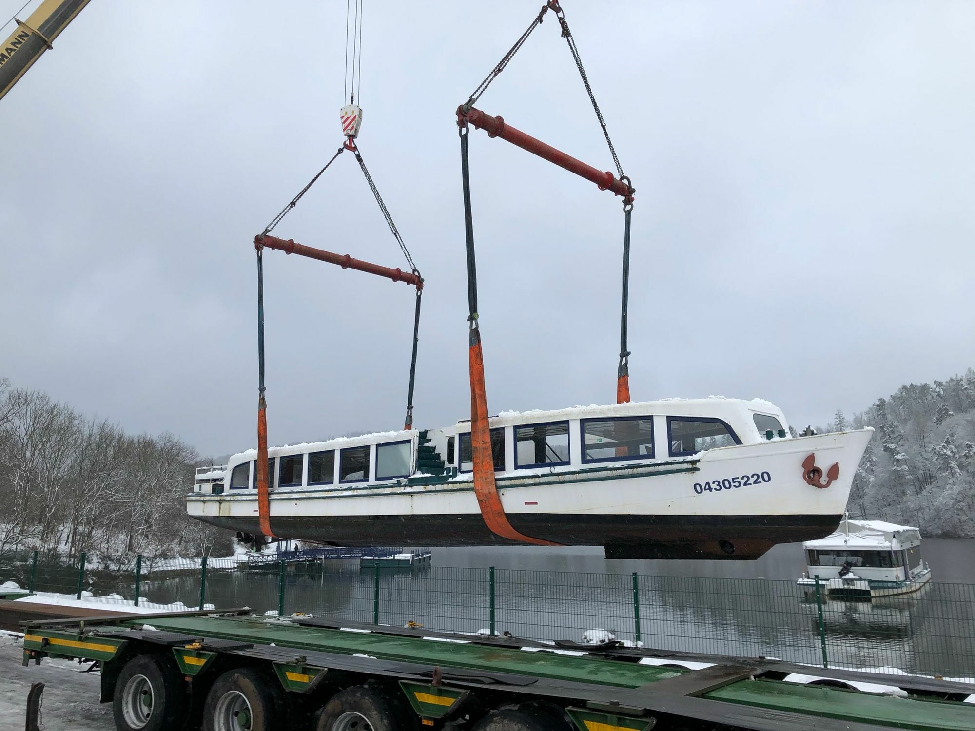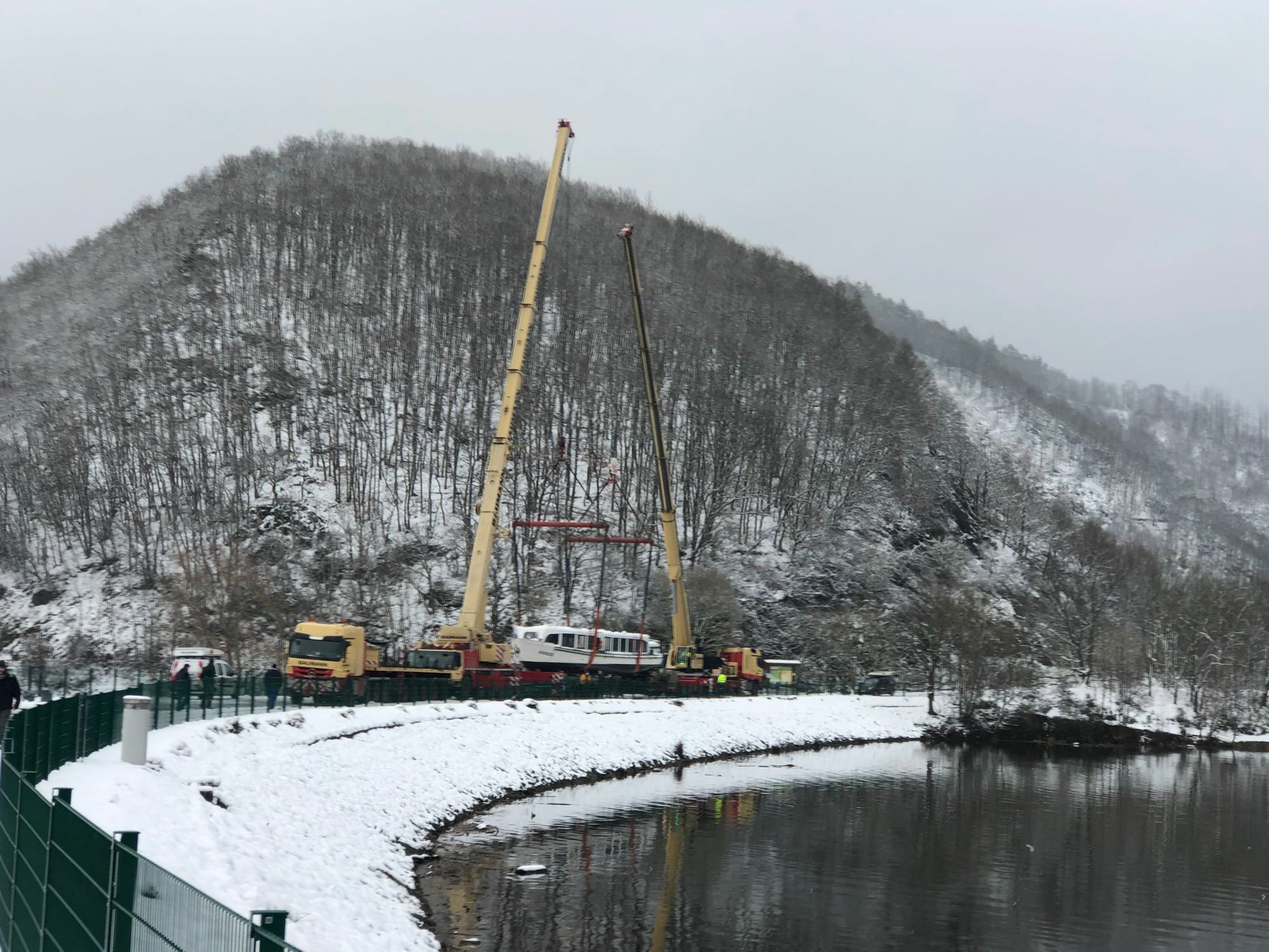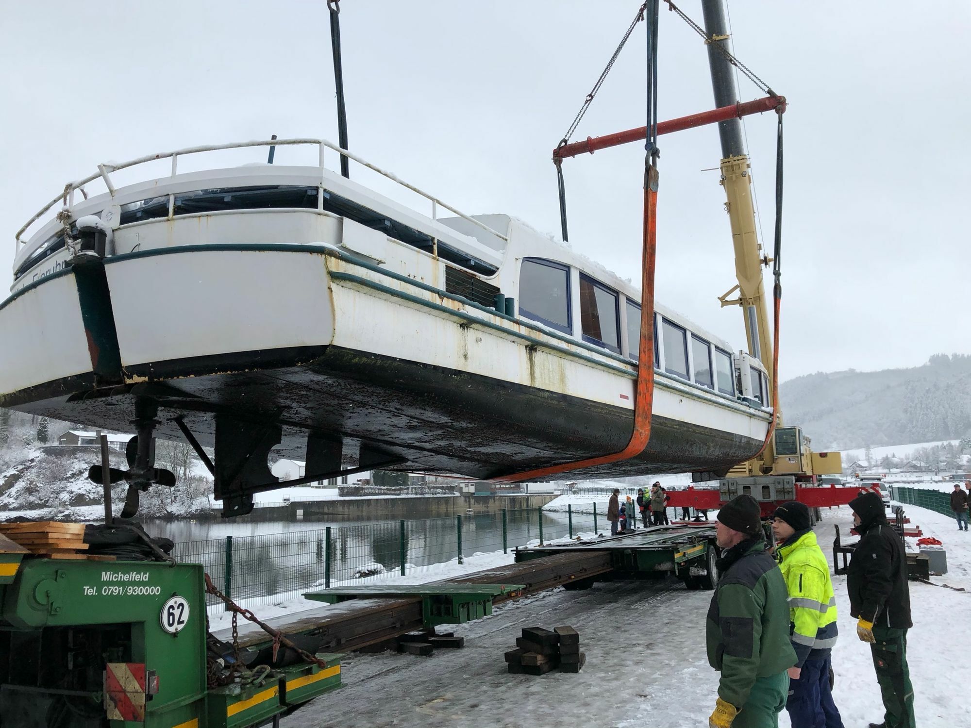 Spektakuläre Bergung über mehrere Stunden bei Eiseskälte am Obersee: Die »Eifel« verlässt die Rurtalsperre und wird künftig als Gastronomieschiff über den Neckar schippern.