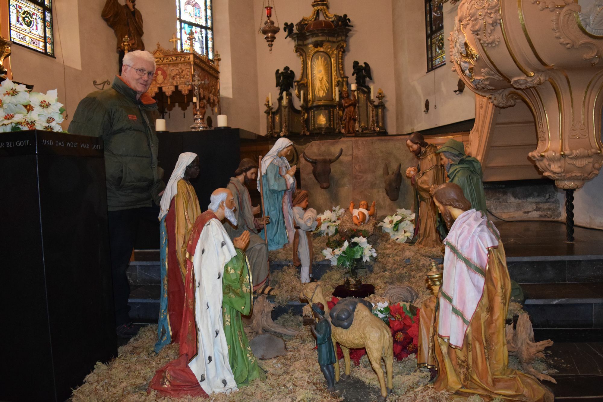 Anfang des 20. Jahrhunderts wurden die hochwertigen Krippenfiguren von den Schwestern »Zum armen Kinde Jesu« aus Aachen für die Monschauer Aukirche gefertigt. Der Rumpf ist aus einem Holz- oder Metallgerüst und mit Kleidung aus Wachs überzogen - Köpfe, Hände und Füße sind gänzlich aus Wachs hergestellt. Als der damalige Dechant Caspar Seeger neue bewegliche Kirppenfiguren aus Holz für die Aukirche beschaffte, fristeten die Wachsfiguren ein Dasein auf dem Speicher der Alten Pfarrkirche - später dann wurden sie von Maria Hast auf den Treppenstufen in der Kirchstraße präsentiert. Als die Dame aus Altersgründen ihre Arbeit einstellte, übernahm Manfred Brandenburg die Betreuung der Wachsfiguren. »Eine gute, trockene und kühle Lagerung ist wichtig«, weiß der 76-Jährige. Schon als Messdiener waren ihm die Figuren ans Herz gewachsen. Seit mehr als zwei Jahrzehnten nun präsentiert er die Heilige Familie, Hirten und Könige vom Weihnachtsfest an bis zum 2. Februar interessierten Besuchern in der Alten Pfarrkirche. »Zum Einstauben wären sie einfach viel zu schade«, unterstreicht Brandenburg.