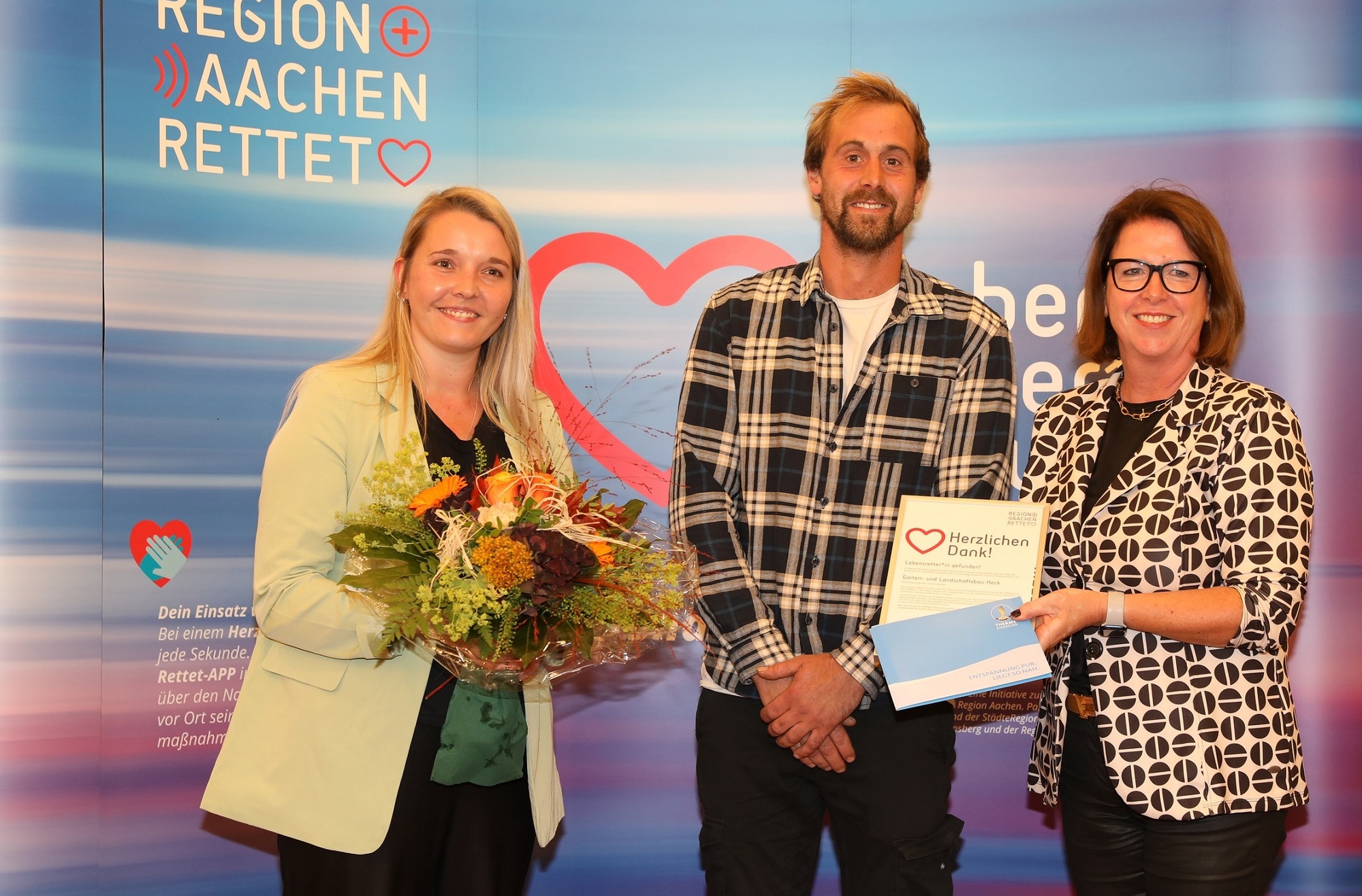 Etwa 70.000 Menschen erleiden jedes Jahr in Deutschland einen Herz-Kreislauf-Stillstand außerhalb eines Krankenhauses. Und nur jeder Zehnte überlebt. »In etwa 44 Prozent der Fälle leiten Ersthelfer Wiederbelebungsmaßnahmen ein. In anderen europäischen Ländern liegt diese Rate bei bis zu 83 Prozent. Ich kann jedem nur ans Herz legen, seine Erste-Hilfe-Fähigkeiten aufzufrischen und sich in der Region-Aachen-rettet-App zu registrieren«, erläutert Dr. Thomas Mann, Ärztlicher Leiter des Rettungsdienstes Kreis Euskirchen. »Erste Hilfe leisten – dazu muss man kein Mediziner sein, das kann im Prinzip jeder. Ich setze mich dafür ein, dass auch die jüngere Generation in Lebensrettung geschult wird. Wer es von klein auf lernt, wird im Notfall beherzt reagieren.«, ergänzt Dr. Cathrin Niedeggen, Kinderärztin im Kreis Düren. Ein wichtiger Baustein der Region-Aachen-rettet-Initiative sind auch Automatisierte Externe Defibrillatoren (kurz: AED), die für die Laienreanimation eine wertvolle Unterstützung bieten. Die Region Aachen baut ein AED-Netzwerk auf, das bereits 766 Defibrillatoren umfasst. »Im besten Fall sind Defibrillatoren öffentlich zugänglich, um im Notfall Leben retten zu können. Von den registrierten AEDs in der Region ist allerdings nur eine geringe Anzahl für die Öffentlichkeit erreichbar«, so Andreas Bierfert, Fachbereichsleiter Feuerwehr und Rettungsdienst der Stadt Aachen. Wer seinen AED bei der Kommune registriert hat, kann einen weiteren Schritt gehen und ihn der Öffentlichkeit zur Verfügung stellen – so wie das ausgezeichnete Unternehmen Garten- und Landschaftsbau H. Müller aus Rollesbroich. Der Familienbetrieb sponserte einen AED, der rund um die Uhr am örtlichen Feuerwehrgerätehaus bereitsteht. Für dieses Engagement wurde das Unternehmen, vertreten durch Inhaber Michael Heck, ausgezeichnet.