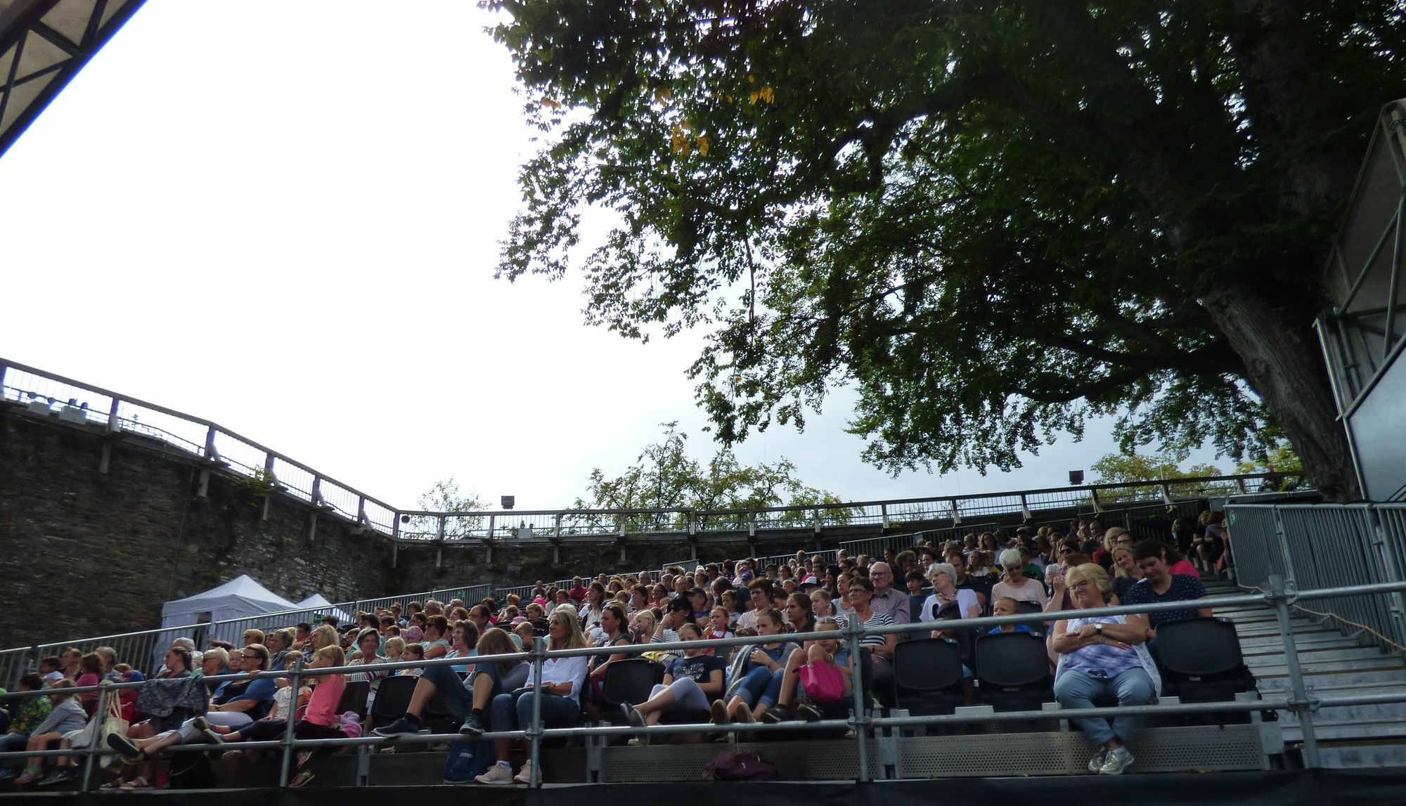 Vor zwei Jahren gaben sie schon mal das gleiche Stück: Mit „Rotkäppchen“ gastierten die Akteure der Musikbühne Mannheim erneut beim Monschau-Festival – denn der ursprünglich vorgesehene „Zwerg Nase“ konnte wegen Erkrankung des Hauptdarstellers nicht über die Bühne gehen. Hunderte von Eltern und Großeltern folgten mit ihren Kleinen der Einladung zu der traditionellen Veranstaltung am Dienstagnachmittag. Regisseurin Karin Grundmann und ihre Truppe taten ihr Möglichstes, um die Herzen der Junioren zu erobern. Rolf (Ingo Wackenhut), der Wolf, der mit dem Golf , wird durch seine eigene Leistung und dank der Musik, die ihm Komponist Frank Steuerwald zugedacht hat, zu einem Sympathieträger, der es mit der Titelfigur (Melina Schöfer) und Großmutter (Christina Prieur) voll und ganz. Die inszenatorischen Eingriffe (Regie: Karin Grundmann) wirkt gut platziert und angemessen. So leisten zu Beginn einige Kinder Rotkäppchen Gesellschaft. Gerappt darf auch werden. Und darum ist die Stunde, die die Aufführung dauert, wie im Flug vergangen.