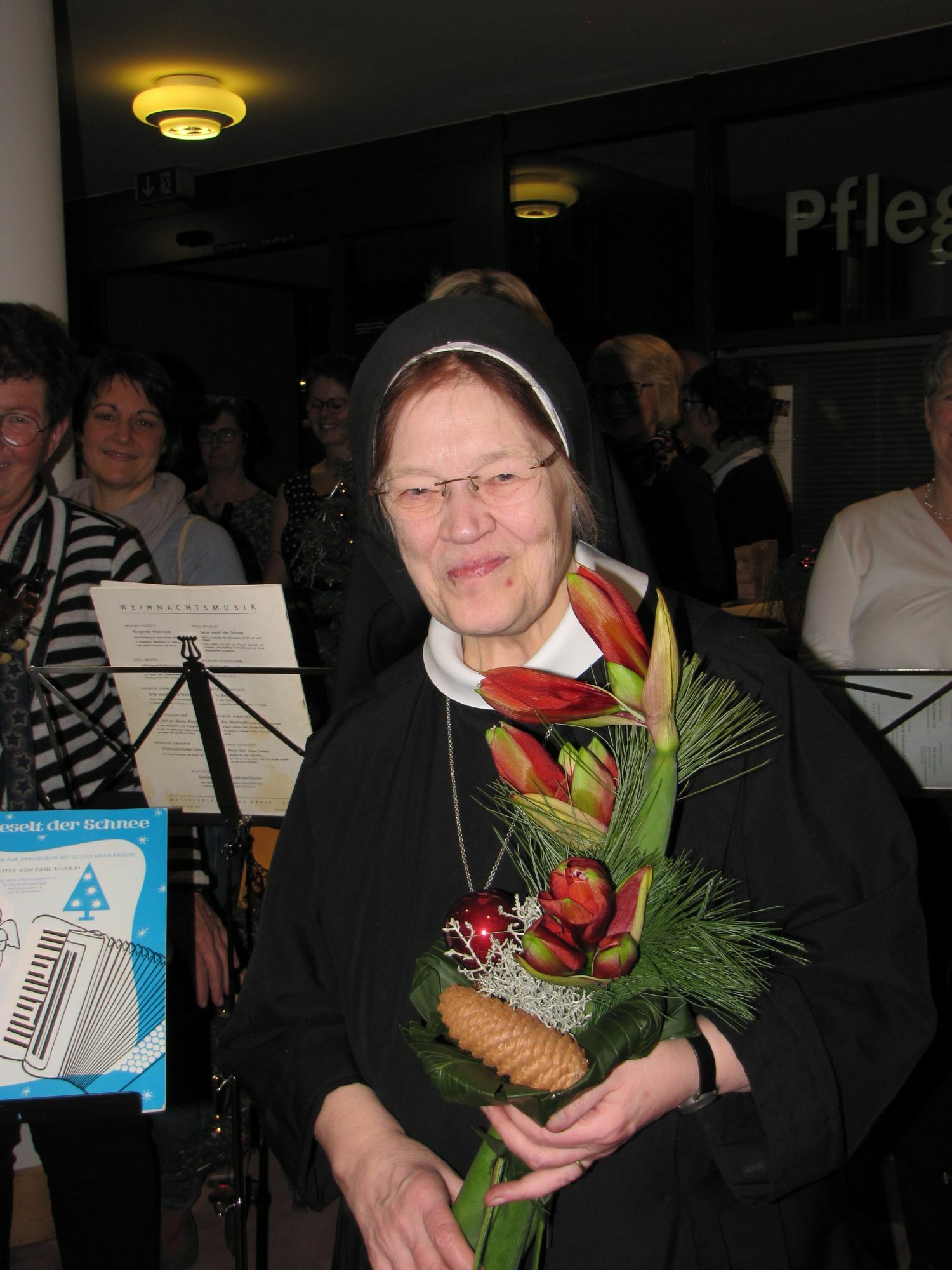 Trommeln, Flöten und Klarinetten, Akkordeon, Gitarren und Mandolinen und schöne Gesangsstimmen aus dem Eifelchor und Maranatha ließen die Herzen höher schlagen. Schwester Gudrun, die diese traditionelle Patientenbescherung organisiert, betonte, es sei ihr wichtig, “den Patienten mit Singen und Musizieren Freude zu schenken; sie dankte allen Mitstreitern für „dieses große Familienfest“. von Anneliese Lauscher