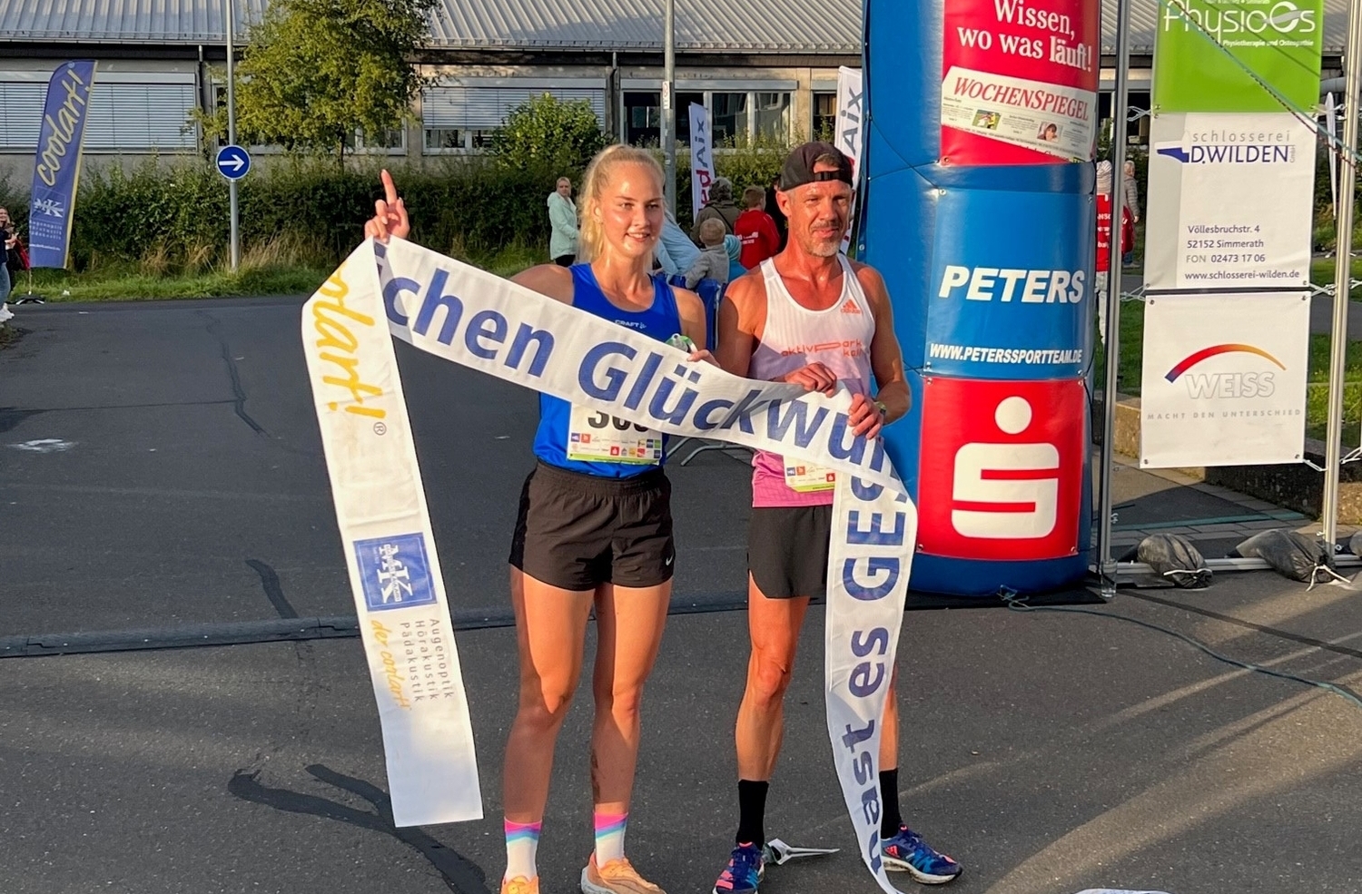 Simmerath (Fö). 350 Läufer und 150 Walker haben die 14. Auflage des Nordeifeler Businessrun in Angriff genommen und eine tolle Firmenparty auf dem Gelände der Sekundarschule Nordeifel gefeiert. Sieger wurde Markus Mey, für eine Sensation sorgte jedoch Sonja Vernikov. Nicht dass die Athletin des Skikeller Kaulard-Schroiff die Damen-Konkurrenz dominierte, sondern ihre Fabelzeit von 18:13 Minuten, womit sie nur acht Sekunden hinter Mey (Aktivpark Kall) ins Ziel kam.