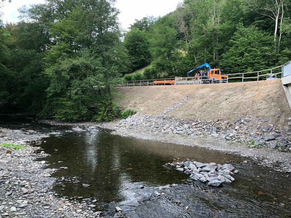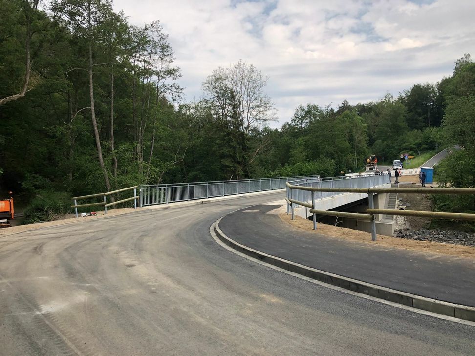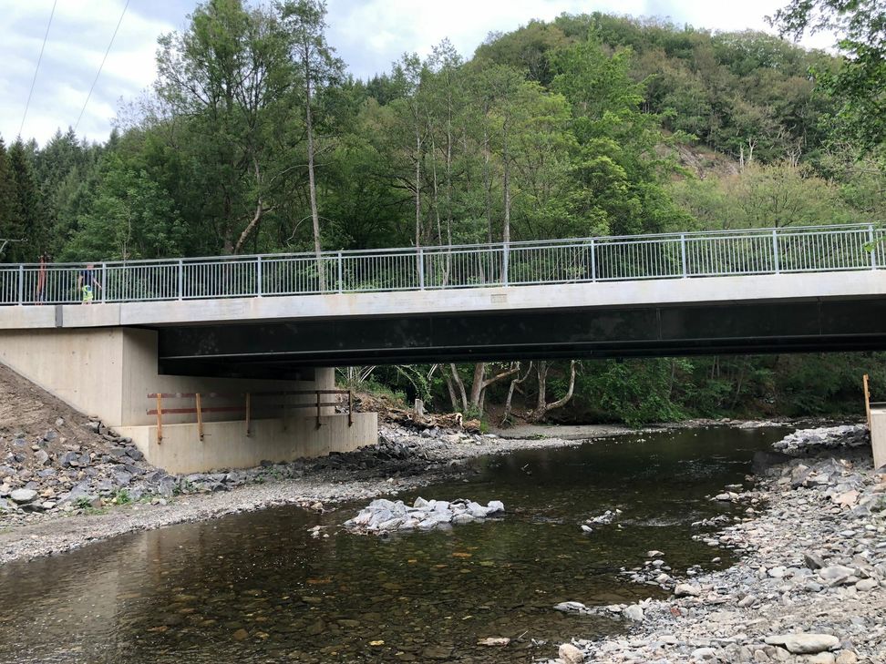 Der Aufschrei war groß, als im letzten Sommer verkündet wurde, dass die K21 im Grünenthal, die Imgenbroich mit Widdau/Rohren und Hammer verbindet, neun Monate lang gesperrt werden sollte. Lange Umwege mussten die Autofahrer in Kauf nehmen, auch Wanderer und Radfahrer konnten das Nadelöhr nicht mehr passieren. Doch der Unmut legte sich rasch, als man merkte, dass an dieser Stelle zügig und zielgerichtet gearbeitet wurde. Bis zum letzten Tag: Denn wie angekündigt wurde die Straße samt erneuerter Rurbrücke nach genau neun Monaten wieder freigegeben. "Die Kritik blieb in den sozialen Medien, wir haben viel Verständnis gespürt", weiß Rudolf Huth von der Baufirma Klein aus Jünkerath. Man habe sogar Touristen per Radlader durch die Rur transportiert, war es für die Bauarbeiter ein Geben und Nehmen mit den Menschen, die sich auf der Baustelle "verirrten". Entstanden ist die erste feuerverzinkte Stahlverbundbrücke in Nordrhein-Westfalen. Da die Stahlträger die gesamte Länge von 25 Metern überspannen konnte - anders als beim Vorgängermodell - auf einen Stützpfeiler im Flussbett verzichtet werden. Und doch waren es spannende Momente, wenn der Kran die Bauteile über eine Hochspannungsleitung hieven musste oder aber den Auflieger der Sattelschlepper in luftige Höhe bugsierte, damit der Lkw in der engen Kurvenlange nach dem Abladen drehen konnte. "Wir mussten den Fels für unsere Fundamente fräsen", erklärt Huth. Eine Sprengung oder Bohren hätte die Wasserleitung womöglich beschädigt. 10,25 Meter ist die neue Rurbrücke breit, sechs Meter davon sind den Autofahrern vorbehalten, 2,50 Meter breit ist der Radweg, der gleichzeitig als Querung für den RurUfer-Radweg zwischen Monschau und Rursee dient. "Es ist natürlich noch nicht alles fertig und doch wurde hier hervorragend gearbeitet", lobt Sander Lutterbach, Leiter des Amtes für Immobilienmanagement und Verkehr der Städteregion Aachen. In den nächsten Tagen wird es noch eine Baustellen-Beschilderung geben - Tempo 50 ist erlaubt -, das neue Ufer wird erst im Herbst bepflanzt und auch der Parkplatz wird noch mit einem Zaun versehen, der nur eine schmale Zufahrt für Autos lässt. Die Baukosten für die insgesamt 160 Meter lange Erneuerung der Kreisstraße 21 betragen 1,7 Millionen Euro - 75 Prozent fördert das Land Nordrhein-Westfalen.