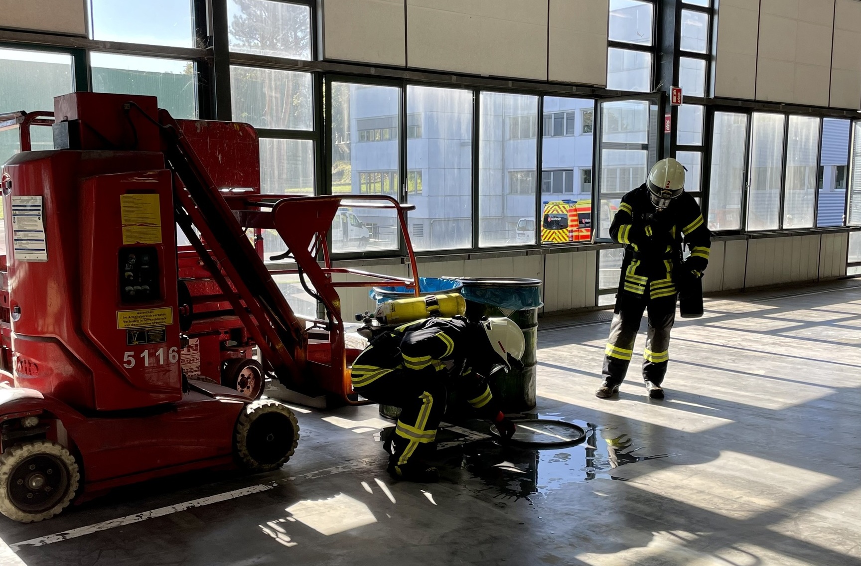 Zum Szenario: Ein Staplerfahrer, der mit einer Palette Beilagen durch die Halle fährt , stößt beim Rangieren an eine Tonne, die mit einerchemischen Flüssigkeit (Säure) gefüllt ist. Die Tonne fällt um und das ätzende Reinigungsmittel läuft aus. Der leicht unter Schock stehende Fahrer und ein weiterer Kollege versuchen noch die Flüssigkeit aufzuwischen und kommen dabei an den Unterarmen mit der Flüssigkeit in Kontakt. Da der Dampf der Flüssigkeit sich durch die Lüftungsanlage schnell in weitere Räume des Betriebs ausbreitet, klagen einige Mitarbeiter bereits über Atembeschwerden, Kopfschmerzen und Husten. Es wird Hilfe alarmiert.