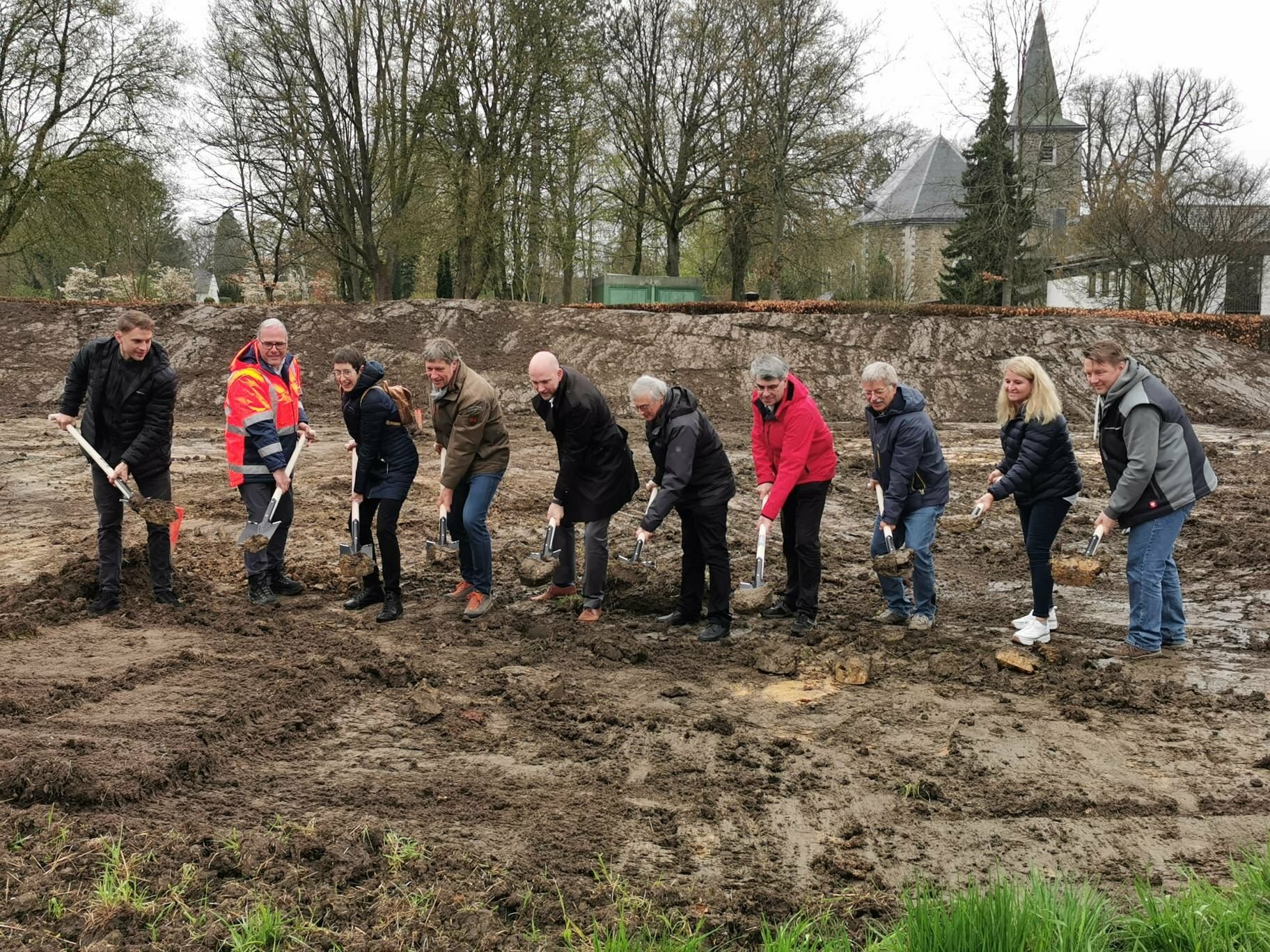 Kurz zuvor setzten Vertreter von Gemeinde Roetgen, der evangelischen Kirchengemeinde Roetgen und bauausführenden Firmen den ersten Spatenstich für die Modulhäuser, die am Wiedevenn errichtet werden.