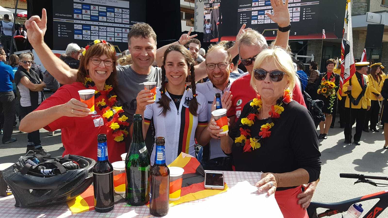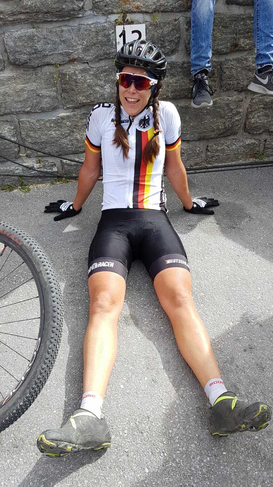 Die Schweiz ist schon ein schönes Fleckchen Erde und für Mountainbiker ein wahres Paradies sodass diese WM ABSOLUT Weltmeisterschaft würdig war. Nun zum Geschehen an sich. Ich muss sagen ich war schon sehr nervös. Vor allem weil ich durch die ganzen Hochzeitsfeiereien das Radfahren ein wenig vernachlässigt hatte. Selber schuld, aber so ist nun mal der andere Teil des Lebens der mindestens genauso wichtig ist. Start- und Finish Loop habe ich mir am Vortag bereits angeschaut.Traumhaft schöne Trails und tolle Bergkulisse versprachen viel.Und so war es auch. Heute morgen fand ich mich dann um 8:40 Uhr mit Startnummer 40 in Startbox 2 wieder und dann wurden wir auch schon alle nach der Reihe aufgerufen bis dann um 9:00 Uhr der Startschuss viel mit mega Publikum und super schnellem Start. Es lief super und ich fühlte mich wohl. Dann ging es in den ersten Trail. Nachdem wir uns mit einer Gruppe von 8 Frauen kurz verfuhren mussten wir erst wieder in den Rhythmus finden. Der Trail war so lang, dass meine Hände kurz vorm krampfen waren, aber die Abfahrt war ein Traum. Nach VP1 ging es auch recht schnell in den ersten Berg, der sich ewig lang zog. Ich fand aber gut in meinen Rhythmus und konnte einige Plätze aufholen. Leider hatte ich die letzten 3km nichts mehr zu trinken und bekam schon nach km 39 meinen ersten Krampf im Oberschenkel. So zog es sich dann durch den Rest des Rennens. Mal die eine und mal die andere Seite. So ungefähr jeder einzelne Beinmuskel war einmal dran. Ich wollte aber niemanden enttäuschen und wenigstens ins Ziel kommen und so kämpfte ich mich doch bis zum Ende irgendwie durch. Natürlich erreichte ich nicht mehr meine Leistung der ersten Hälfte des Rennens, aber es gelang mir die Krämpfe immer wieder rauszutreten und doch noch bis zur Finish Loop zu kommen, wo ich dann im Zielsprint nochmal einen Platz gut machen konnte uuund es vor den ersten Männern über die Ziellienie geschafft habe. Es war ein wahnsinnsgefühl so viel Publikum zu haben, den Menschen einen Handschlag zu geben bei der Zieleinfahrt, ohne Defekte die WM beenden zu können und meine treuesten und besten Fans vor Ort zu haben. Ein besonderes Danke an meinen Mann Jan, meine Eltern, Monika und Helmut für die Unterstützung und die Betreuung.