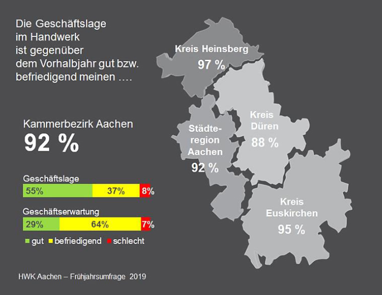 Das zumindest ist das Ergebnis der Konjunkturumfrage der Aachener Handwerkskammer, an dem 335 Betriebe aus der Städteregion Aachen sowie den Kreisen Düren, Euskirchen und Heinsberg teilgenommen haben. »Unsere Handwerker trotzen den Konjunktur-Pessimisten und sind damit gar nicht typisch deutsch. Wo wir doch gerne mal etwas vorschnell schwarz malen«, erklärt Peter Deckers, Hauptgeschäftsführer der Handwerkskammer Aachen. Sehr zufrieden vermeldet er einen Rekordwert nach dem anderen: Seit 2014 befinde sich das Handwerk in der Region im Dauerhoch und dabei steche das Baugewerbe noch einmal heraus. So sind 92 Prozent der Handwerker mit der aktuellen Geschäftslage zufrieden und nur sieben Prozent erwarten keine positive Entwicklung in den kommenden Monaten. 8,6 Wochen dauere es mittlerweile, ehe ein Handwerker seine vereinbarte Leistung erbringen können. Auf dem Bau muss gar mit einer Vorlaufzeit von vier Monaten gerechnet werden. »Die Auftragsbücher sind voll und Fachkräfte stehen nicht auf der Straße«, stellt Deckers klar. Daher betrübt ihn auch ein wenig der Blick auf den Lehrstellenmarkt. Mit 2200 Lehrverträgen stiegen zwei Prozent weniger junge Menschen in eine Berufsausbildung des Handwerks ein. »Die reinen Handwerksberufe liegen noch im Plus, der kaufmännische Bereich hat Probleme«, stellt Deckers heraus. Dennoch würden gerade Elektroinstallateure, Heizungsbauer und -installateure, Tischler, Kfz-Mechaniker und Friseure gesucht.