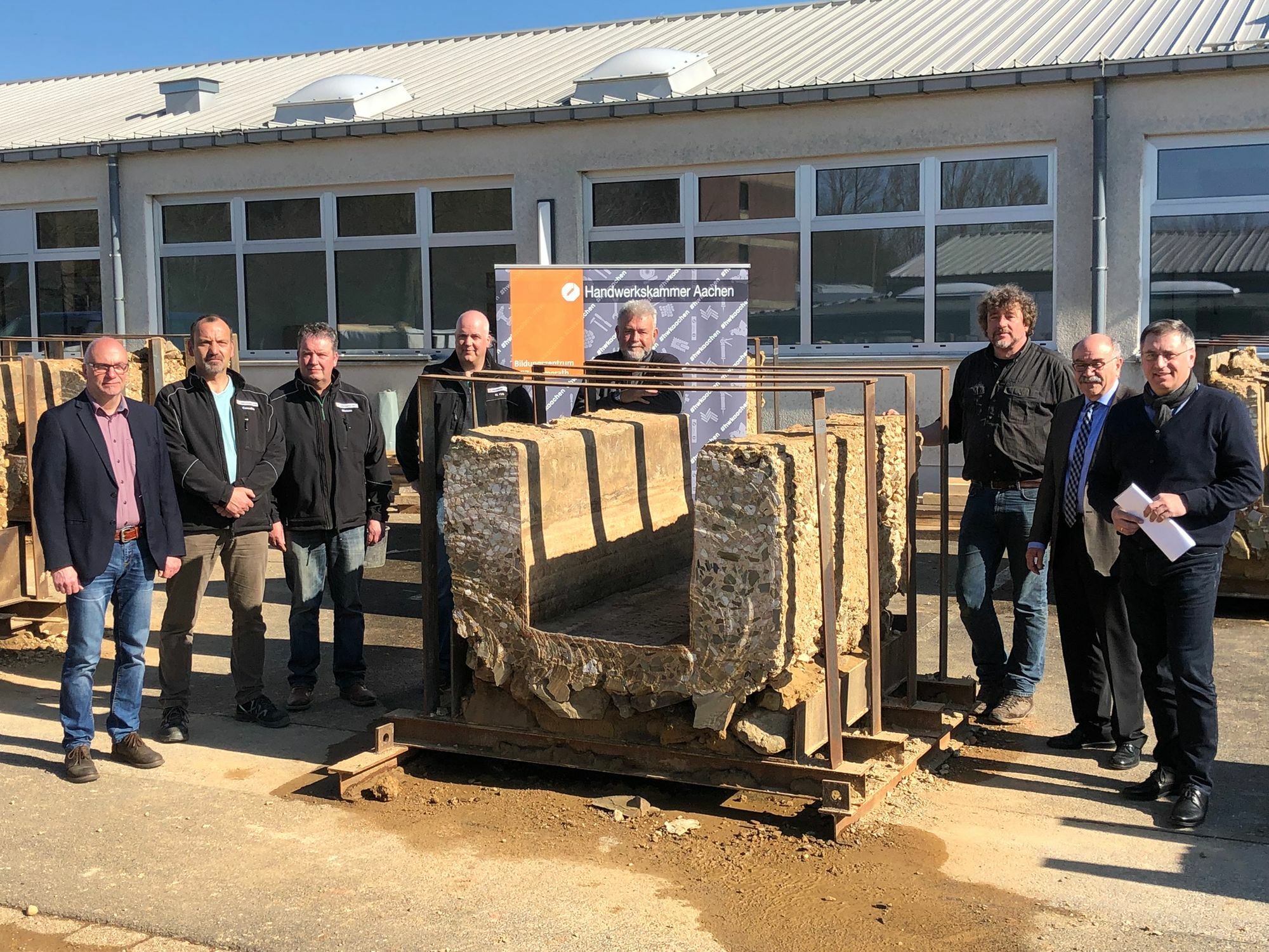 Eines dieser Teilstücke soll nach den erfolgten Arbeiten im BGZ Simmerath verbleiben und somit als historisches Bauelement für die Öffentlichkeit zugänglich werden. »Es muss vor Witterung und Vandalismus geschützt werden und soll im Bereich des neuen Internats einen würdigen Platz bekommen«, versichert Wilhelm Grafen, Geschäftsführer für die Bildungszentren bei der Handwerkskammer Aachen. 9500 Euro kostet jedes der 22 Teilstücke, die man erwerben kann.