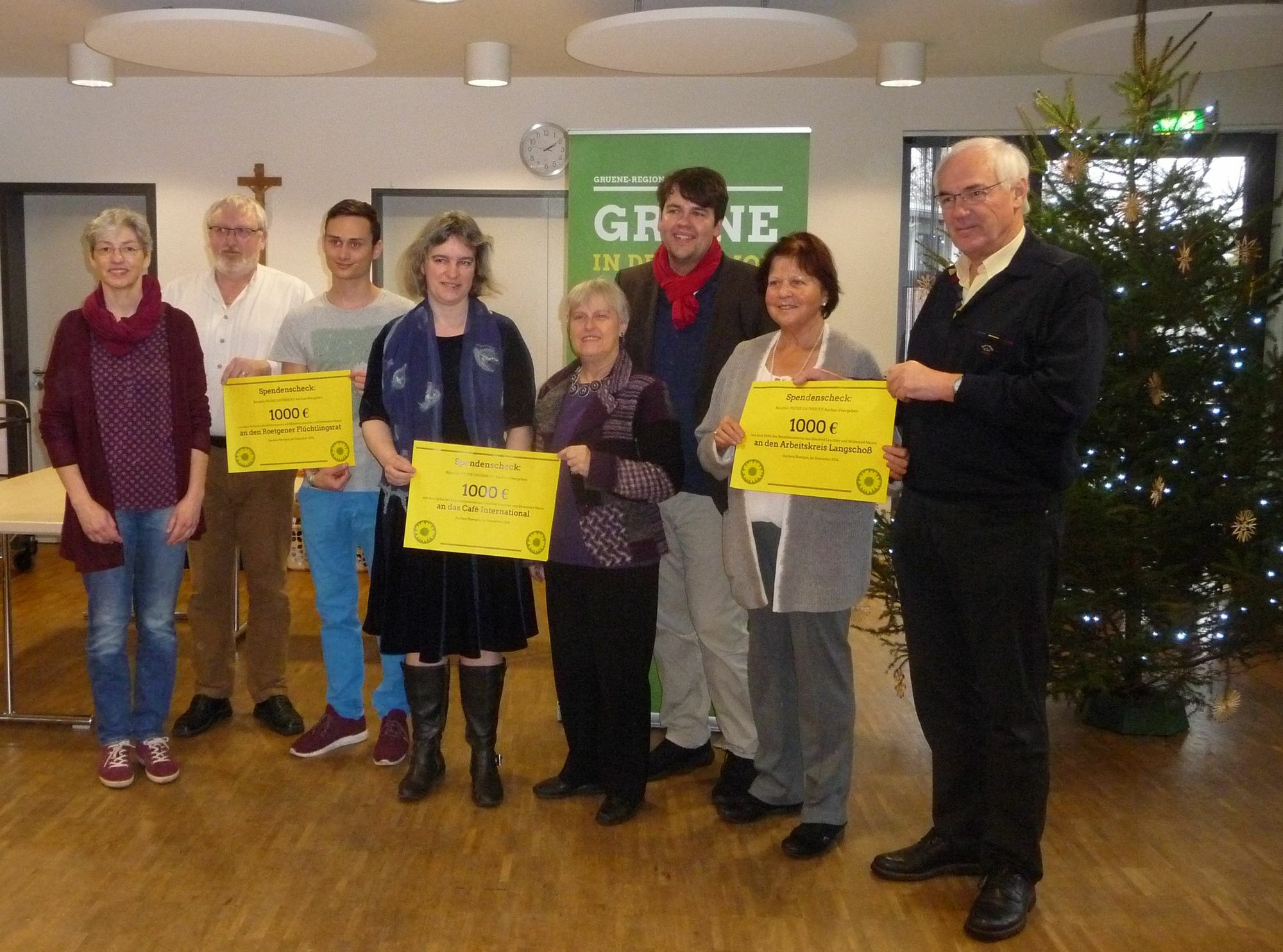 Daher gilt der Dank der Veranstalter vor allem dem Duo Manfred Leuchter / Mohamed Najem. Durch ihren Honorarverzicht konnte ein Erlös in Höhe von 3.000 Euro erzielt werden, der nun an die drei Flüchtlingsorganisationen in der Nordeifel weitergegeben wurde. Der Dank gilt aber auch den spendablen Gästen im voll besetzten Bürgersaal, die mit ihren Eintrittsgeldern und weiteren Spenden am Abend diese Summe zusammen getragen haben. Barbara Dohr-Buschmann und Johannes Pössinger vom Roetgener Flüchtlingsrat, die Eheleute Lepers vom Arbeitskreis Langschoß sowie Vera Rupp-Franksen und Maria Schütz als Vertreterinnen des Café International in Monschau sind gekommen um stellvertretend für ihre Initiativen den symbolischen Scheck entgegen zu nehmen. Das Geld soll für die Integrationsarbeit eingesetzt werden und den vielen Ehrenamtlichen in den Initiativen mehr Spielraum verleihen, denn nicht für alle Projekte und Aktivitäten gibt es ausreichend öffentliche Fördermittel. Alexander Tietz-Latza, Vorsitzender des grünen Kreisverbandes, und Lukas Benner von den Roetgener Grünen freuen sich, dass sie so kurz nach Weihnachten noch diese »Geschenke« überbringen durften. Benner: »Ich habe Hochachtung vor der Arbeit, die die Ehrenamtlichen in der Initiativen geleistet haben und leisten. Das ist von unschätzbarem Wert für die Geflüchteten, die versuchen hier wieder Fuß zu fassen und sich eine neue Zukunft aufzubauen.