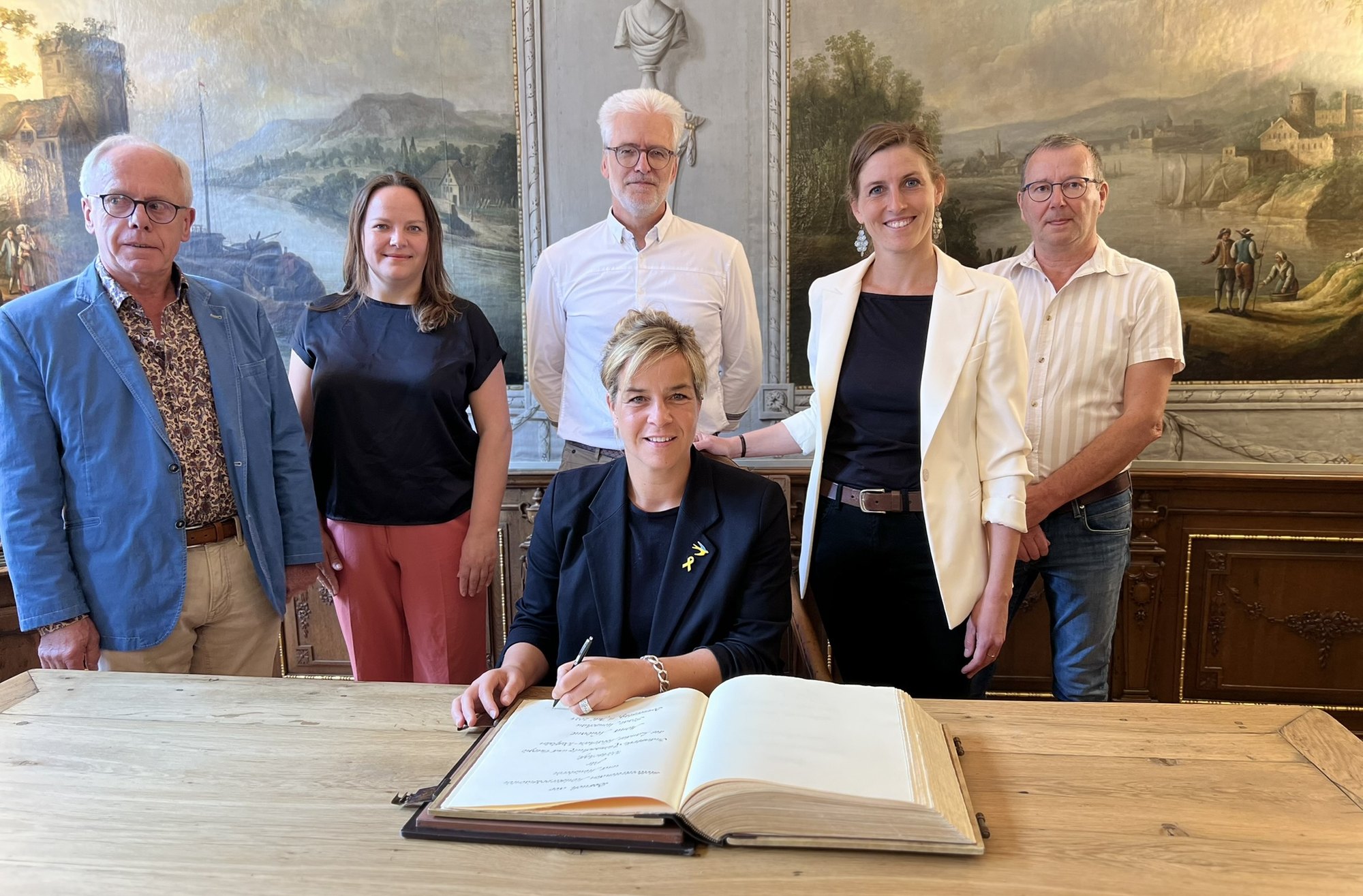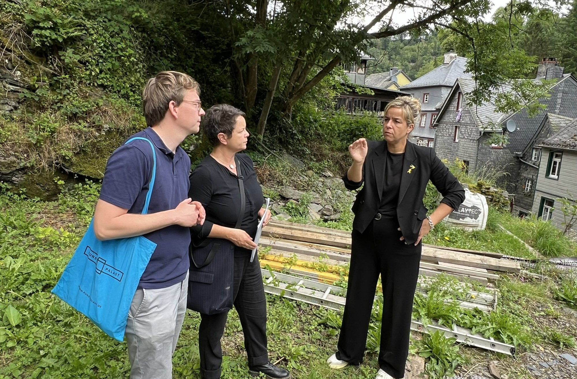 Der Stadtspaziergang startete im Haus Troistorff, wo sich trägt die Ministerin im Beisein von Bürgermeisterin Dr. Carmen Krämer ins Goldene Buch der Stadt Monschau eintrug. Beim anschließenden Stadtspaziergang, mit der Interessengemeinschaft Monschau – Zukunft mit Geschichte e.V. – steht der Erhalt von Baudenkmälern und der Monschauer Altstadt im Fokus. Interessiert lauschte sie den Herausforderungen und Alleinstellungsmerkmalen der einstigen Tuchmacherstadt. Eine schwierige Infrakstruktur und kostenintensive Instandhaltungsmaßnahmen prägen das Fachwerkstädtchen. »Aber genau deswegen kommen die Menschen hierher«, stellte Neubaur die Schönheit der Altstadt heraus. Die Ministerin besuchte verschiedene Ladenlokale, die Tradition, Innovation und Heimat verbinden: die Weberei »Gern gesehen«, den Modedesigner Joah Kraus oder das Viertelhaus, das gerade getragen von großem gesellschaftlichem Engagement restauriert wird. ISG-Vorsitzender Dr. Jascha Braun und seine Mitstreiter zeigten auf, wie man das nahezu verfallene Denkmal zum Showraum für Altbausanierung machen und Raum für Treffen der Altstadt-Bewohner schaffen möchte. Ein sonnenverwöhnter Garten rundet das einzigartige Ambiente ab.