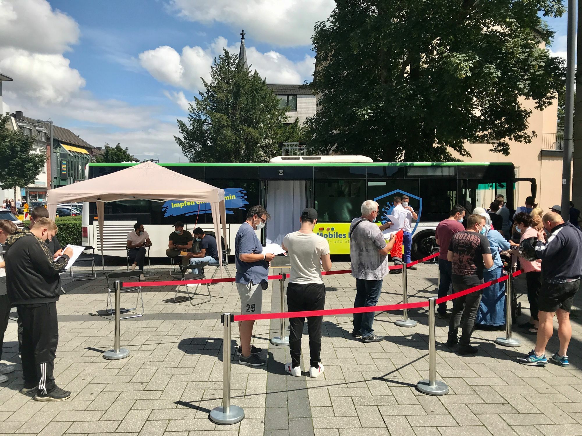 Als zusätzliches Angebot werden nun auch Impfbusse aufsuchende Impfungen in der StädteRegion Aachen anbieten. Sie werden vor allem bei öffentlichen Veranstaltungen, in Fußgängerzonen und in dafür vorgeschlagenen Stadtteilen Station machen. Hier werden sehr einfach und ohne Voranmeldung Impfungen angeboten. Der Impfstoff kann frei gewählt werden. Der erste Impfbus hat beim verkaufsoffenen Sonntag anlässlich des Stadtfestes Eschweiler am Sonntag in der Eschweiler Innenstadt gestanden. Dort haben binnen fünf Stunden rund 150 Menschen ihre erste Impfung erhalten.