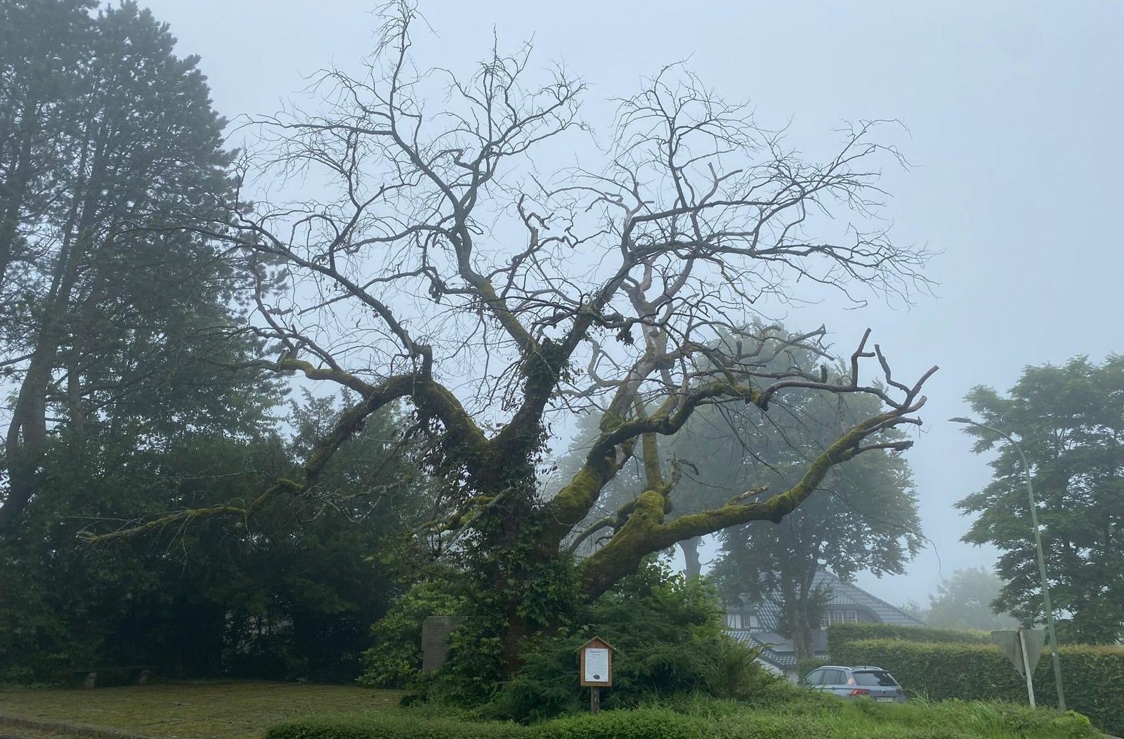 Die denkmalgeschützte Bergulme in Rohren zeigt seit 2022 erste Anzeichen des Absterbens. Auf einem Bürgertreffen informierte Ortsvorsteher Maik Gabbert nun über das weitere Vorgehen.