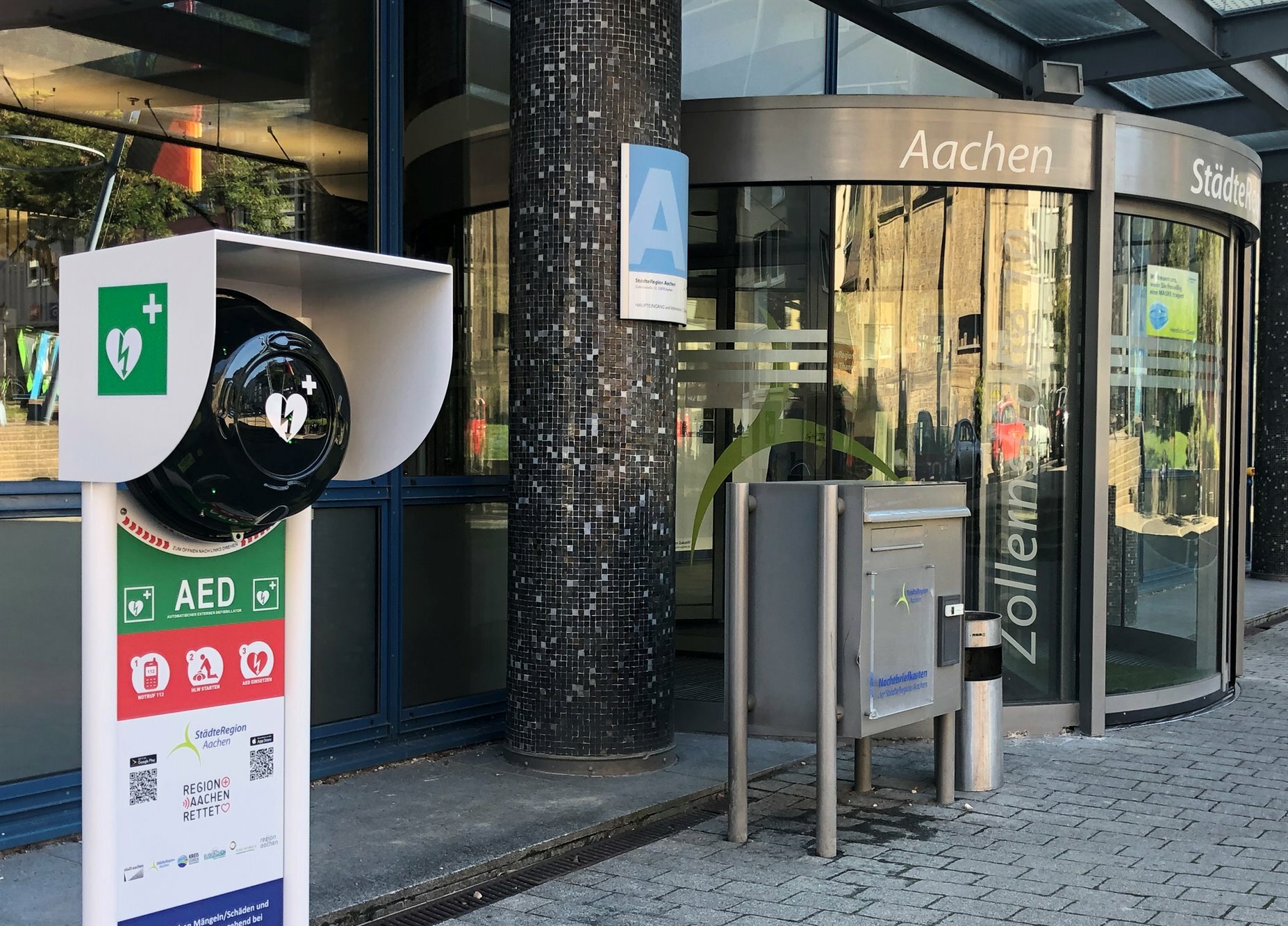 Grüttemeier will ein flächendeckendes Netz an Defibrillatoren aufbauen und geht mit gutem Beispiel voran. Am Haus der Städteregion in der Aachener Zollernstraße steht ein solcher Lebensretter direkt am Haupteingang.