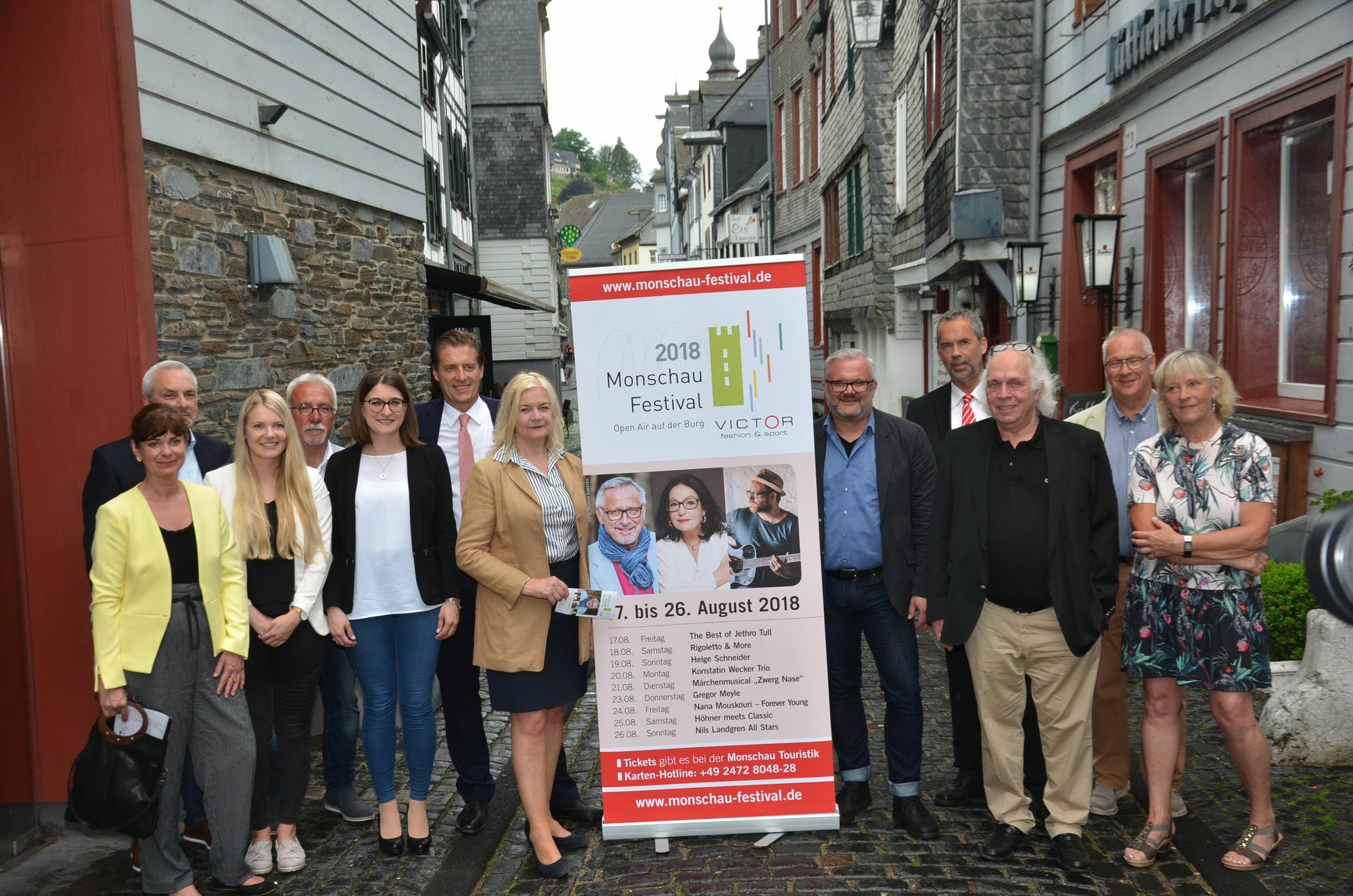 Mit diesem Paukenschlag im Programm des 19. Monschau Festival vom 17. bis 26. August hatten Dorit Schlieper und Helmut Lanio zur Pressekonferenz geladen. Die Macher des Veranstaltungsreigens hoch oben über der Altstadt haben aus der beliebten Monschau-Klassik ein Festival gemacht, das jeden Musikgeschmack anspricht. »Durch die Programmvielfalt und das Abdecken vieler Genres können wir immer mehr Eifeler als Gäste auf der Burg begrüßen«, stellt Bürgermeisterin Margareta Ritter erfreut fest. Waren es in den Anfangsjahren vor allem Kulturbegeisterte aus dem Großraum Köln-Düsseldorf, so locken Weltstars wie Nana Mouskouri, Jethro Tull oder die Höhner Musikfreunde aus der ganzen Region an. »Ich hoffe, dass ich als Schirmherr noch eine Karte für Jethro Tull bekomme«, möchte der neue Präsident der Industrie- und Handelskammer Aachen, Wolfgang Mainz, gleich mehrere Veranstaltungen auf der Burg Monschau besuchen. »Hans Georg Weiss hat einen Kraftakt vollzogen, der kulturell und wirtschaftlich in der Region viel bewegt hat«, so der Schirmherr des 19. Monschau Festival. Er zollte Schlieper und Lanio seinen Respekt für deren Engagement und glückliches Händchen bei der Programmauswahl.