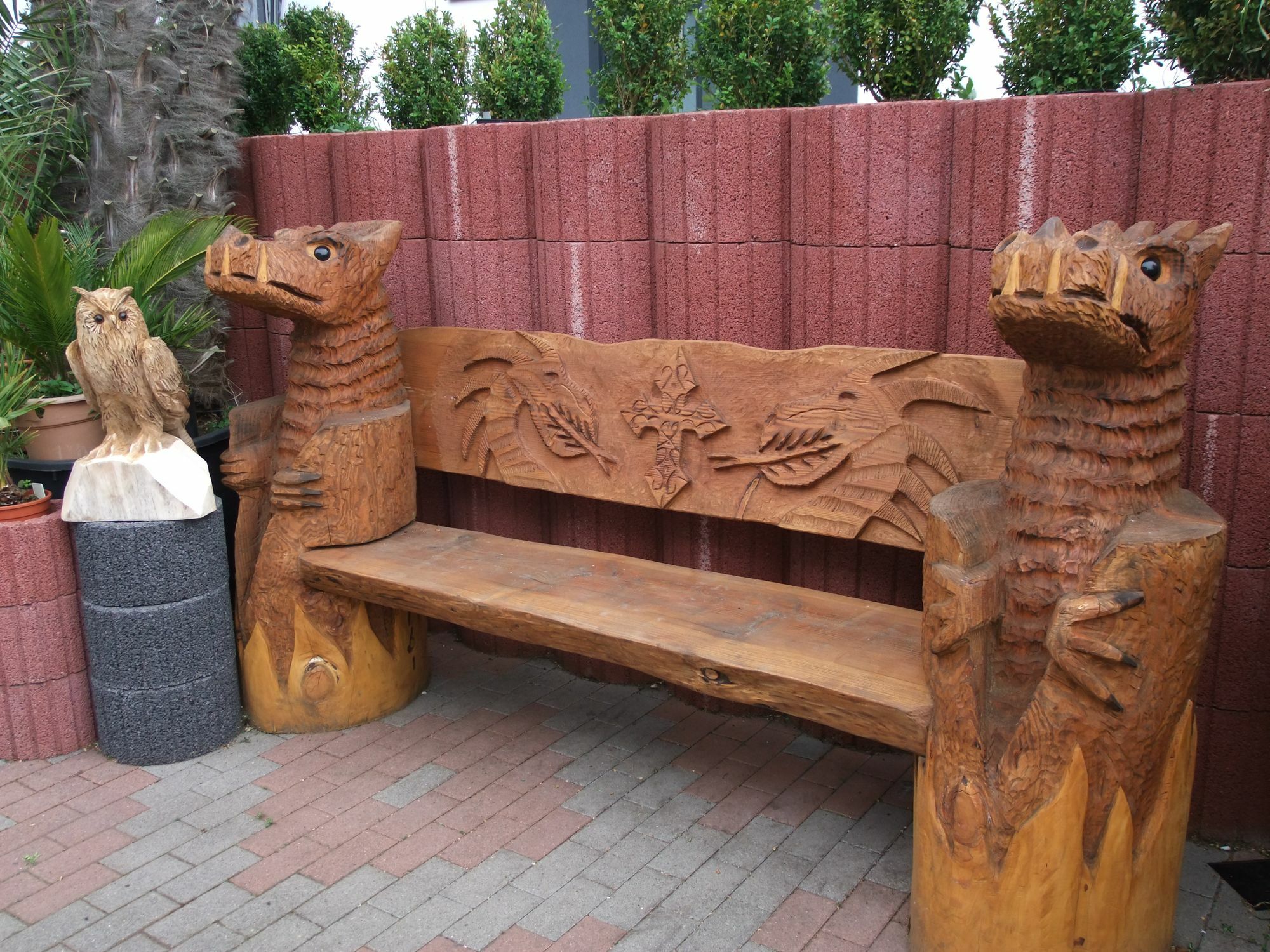 Auf der anderen Seite des Tores thront eine Eule königlich und blickt über das Reich des Kettensägenmannes. Zu seinen sechs verschiedenen Adlern gesellen sich zahlreiche weitere hölzerne Wesen wie etwa Hunde, Affen, Drachen oder auch Eulen, die den von Hand hergestellten Bänken den letzten Schliff geben.