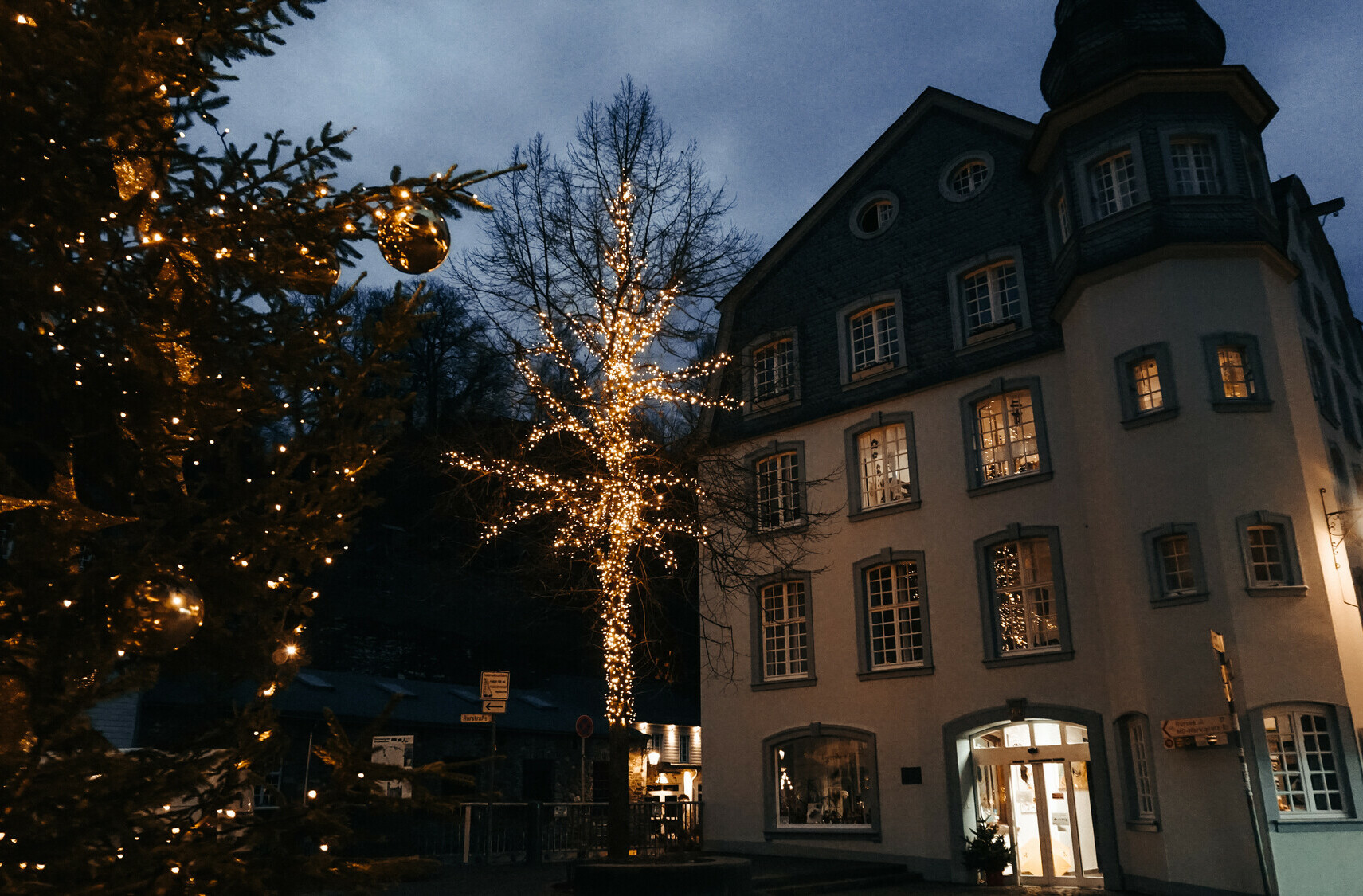 Ein echter Hingucker ist das Tuchmachergebäude »Haus Troistorff« an der Laufenstraße, das mit seinen künstlerisch gestalteten Glasobjekten ab dem 1. Advent als Adventskalender erstrahlt. Hier werden die Fenster mit Einbruch der Dämmerung täglich bei musikalischer Untermalung beleuchtet.