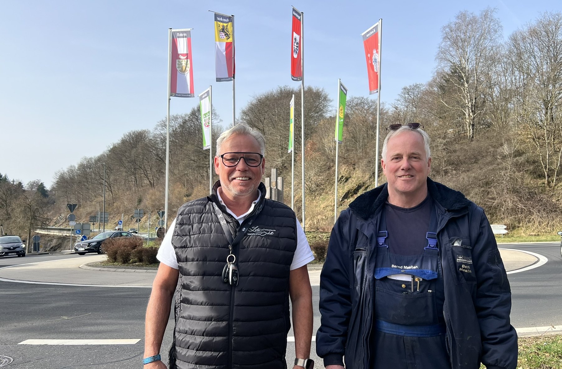 Monschau (Fö). Wenn der Wind gut steht, dann wehen sie alle in die gleiche Richtung. »So verschieden Stadt und Dörfer doch sind, um so mehr wird den Bewohnern bewusst, dass man nur zusammen Zukunft gestalten kann«, wissen Lutz Schell und Bernd Maaßen von der Monschauer Event gUG. Für diesen Gedanken stehen symbolisch die sieben Fahnenmasten auf dem Kreisel an der Monschauer Flora. Die verbindende Holzskulptur inmitten des Kreisverkehrs ist schon so alt wie er selbst - die Stelen aus Douglasie richten sich in ihrer Länge nach der Bevölkerungszahl (obwohl da 20 Jahre später manche verlängert und manche eingekürzt werden müsste) und weisen in ihrer Ausrichtung auf die Lage der Orte. Zusammengehalten werden sie durch ein Bronzeband. Außerhalb steht eine zusätzliche Stele für die Partnerstadt Bourg St. Andéol.