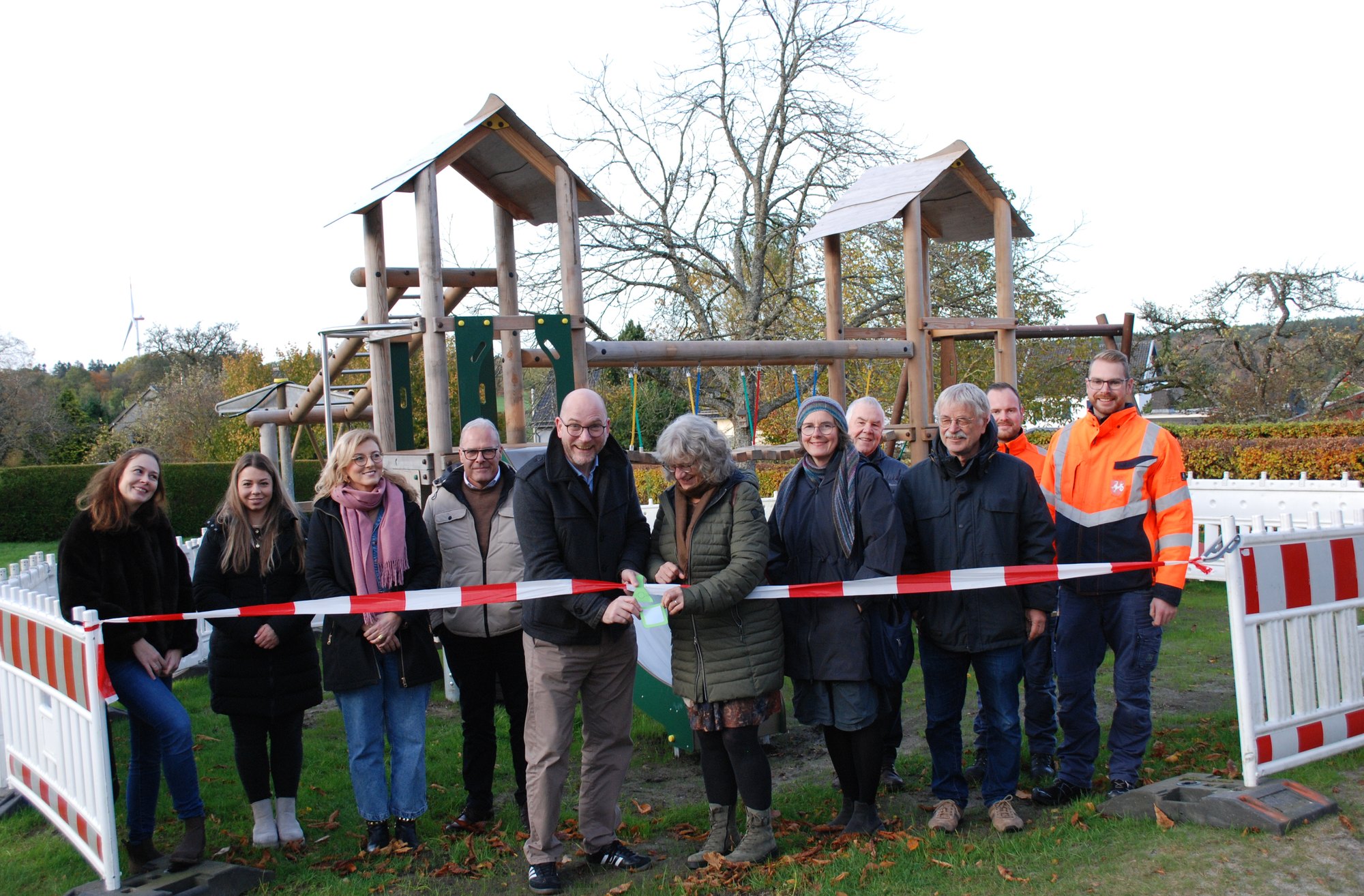 Roetgen (Fö). »Soll ich zuerst rutschen oder hangeln?« fragte Roetgens Bürgermeister Jorma Klauss etwas scherzhaft bei der Eröffnung des neuen Spielgerätes neben der Marienkapelle an der Hauptstraße. Auf dem laut Bürgermeister »wichtigsten Spielplatz im Gemeindegebiet« wurde eine neue Spielanlage mit zwei Türmen, Rutsche, Hangelleiter, Hängebrücke, Kletternetz und -wand sowie Feuerwehrstange vom Bauhof errichtet. Auch drei neue Federtiere und sanierte Hangelstangen ergänzen das große Angebot, das »nicht nur ein Anziehungspunkt für Kinder, sondern ein Treffpunkt für ganze Familien ist«, wie Ingrid Karst-Feilen, Vorsitzende des zuständigen Bildungs-, Generationen-, Sozial- und Sportausschusses der Gemeinde, feststellte.