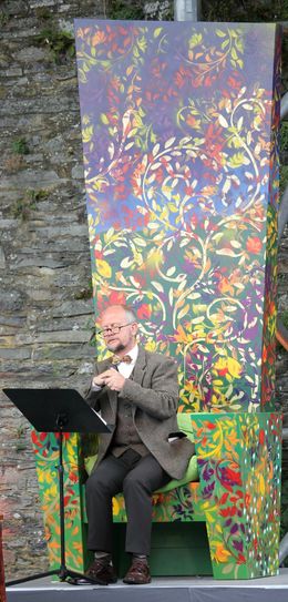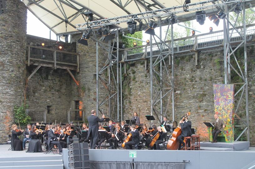 Flankierend zur Gestaltungskraft der Französischen Kammerphilharmonie unter der Leitung von Philip van Buren setzten Ausrichter besonders auf einen bekannten Eifeler Akteur: Ralf Kramp, Karikaturist, Krimiautor und Verleger. Der bewies, dass er es nicht nur drauf hat, wenn es darum geht, Literatur und Leser über den Verkauf von Büchern zusammen zu bringen. Mit einer Stimme voller suggestiver Kraft den Konzertbesuch zum Freiluft-Hörspiel. Erscheinungsbild und Wesensart der Vierbeiner ließ Kramp, der in der Vulkaneifel lebt, den Text mit jedem Zungenschlag in tausend Farben leuchten. Ente, Vogel und andere Wesen, die zu Prokowjews Musik neben den beiden Titelfiguren die Erzählung von „Peter der Wolf“ bevölkern, tollten ebenso quicklebendig umher wie Schwan, Elefant, Schildkröten & Co. Aus dem „Karneval“ von Saint-Saens. Vom hohen künstlerischen Standard überzeugten sich auch Monschaus Bürgermeister Margareta Ritter sowie die beiden Geschäftsführer der Monschau Festival gGmbH, Dorit Schlieper und Helmut Lanio. Ralf Kramps Talent, Figuren ganz allein aus der Kraft der Stimme lebendig werden zu lassen, fand bei ihnen und den weiteren rund 700 Zuschauern ebenso Anklang wie die feinsinnige Art von Philip van Buren und seinem musikalischen Mitstreitern, Körperbau und Wesensart der Tiere in Klänge und Melodien umzusetzen. Feinsinnig, pointiert und beweglich im Spiel – eine solche Begegnung macht Lust auf ein Wiederhören. Die Mitglieder der Kammerphilharmonie erwiesen sich auf der Burg jedenfalls als Künstler mit Herz.