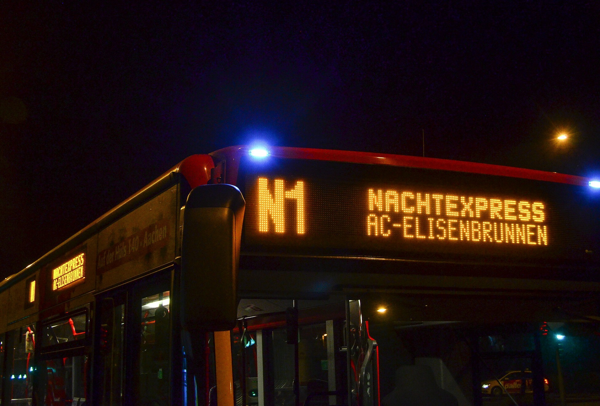 Die Nachtexpress-Linien N1 bis N9 fahren ab Bushof/Elisenbrunnen um 1.30 Uhr, 2.30 Uhr Sommerzeit (MESZ), 2.30 Uhr Normalzeit (MEZ) und 3.30 Uhr ab. Ab 5.30 Uhr fahren dann wieder die ersten Busse der Tageslinien ab Aachen Bushof.