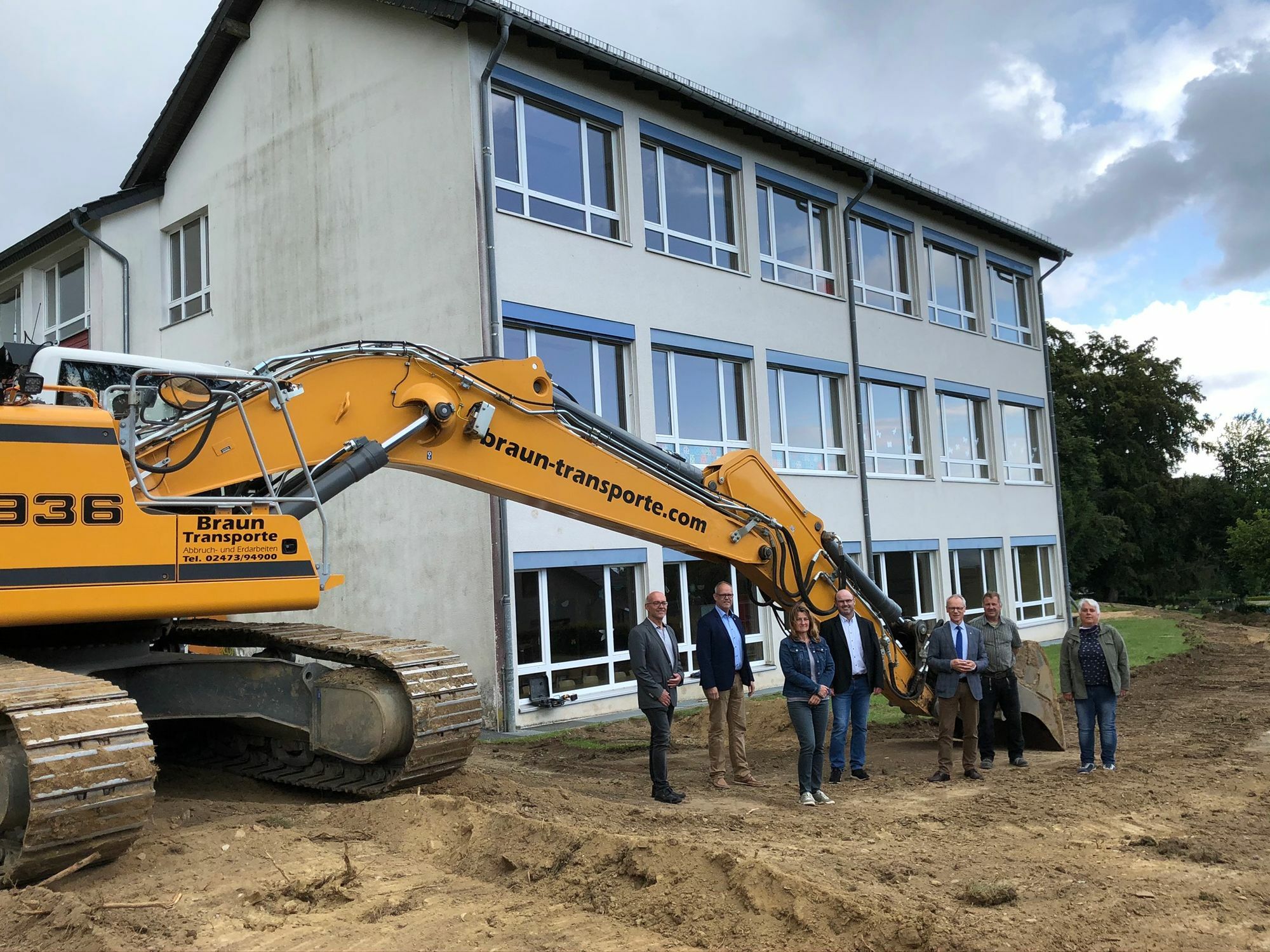Unter Federführung der Architektin Alexandra Nikolaizig aus der Strukturabteilung der Gemeinde Simmerath wurden ein dreigeschossiger Anbau geplant, der auf jeder Etage einen großen Gruppenraum und einen Neben-raum beinhaltet. Rund 70 Quadratmeter Nutzfläche werden bis Sommer 2021 angebaut, mit den Tiefbauarbeiten hat Hans-Jürgen Niehsen bereits begonnen - der Rohbau soll bis zu den Herbstferien stehen. Vorgesehen ist würfelförmiger Anbau mit Flachdach im rückwärtigen Bereich, der um zwei Meter versetzt an den jetzigen langge-streckten Baukörper entlang der Straße »In Steckenborn« (L 128) Richtung Schulhof angebaut wird. Ein Musikraum und zwei Räume für das Angebot der Offenen Ganztagsschule werden dort entstehen.