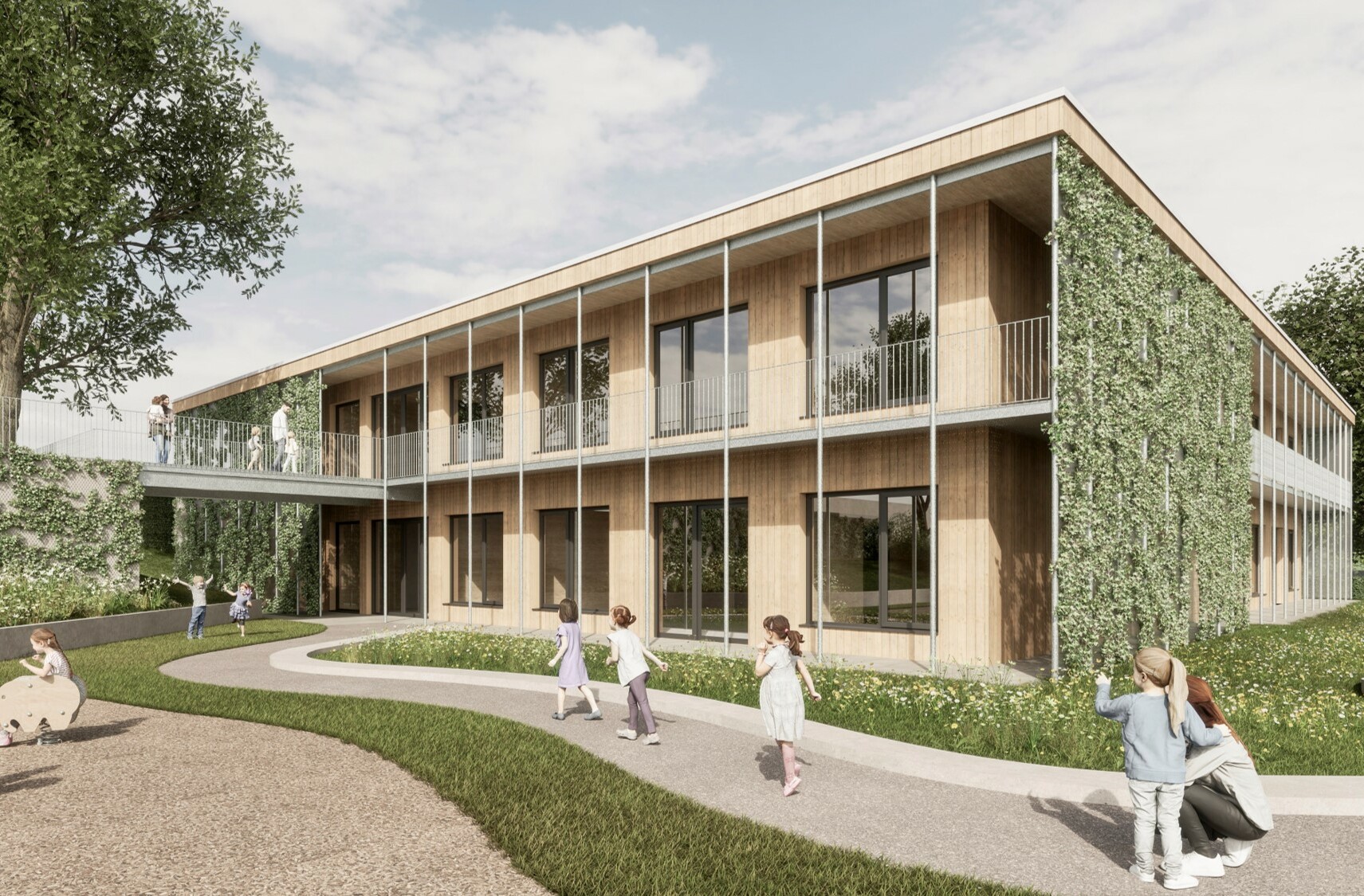 Das neue Grundstück zwischen Eupener Straße und »Im Schnellenwind« hat eine Fläche von knapp 3000 Quadratmetern. Neben 1.500 Euro Bruttoraumfläche wird auf 1.637 Quadratmetern die Außenspielfläche entstehen, die durch abwechslungsreiche Spielbereiche und Erlebnisräume geprägt sein wird. Auch reichlich Raum für Stellplätze von Personal und Eltern ist gegeben, die gegenüber der Ringstraße die Zufahrt bekommen. Die Freifläche wird von »Schnellenwind« aus erschlossen.