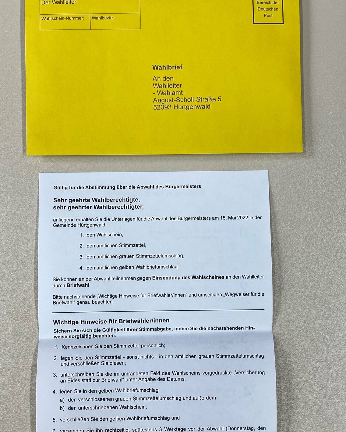 Hürtgenwald. Die Gemeinde Hürtgenwald teilt mit, dass bei der Ausstellung der Briefwahlunterlagen zur Landtagswahl und zur Abstimmung über die Abwahl des Bürgermeisters fehlerhafte Briefwahlunterlagen ausgestellt worden sind.