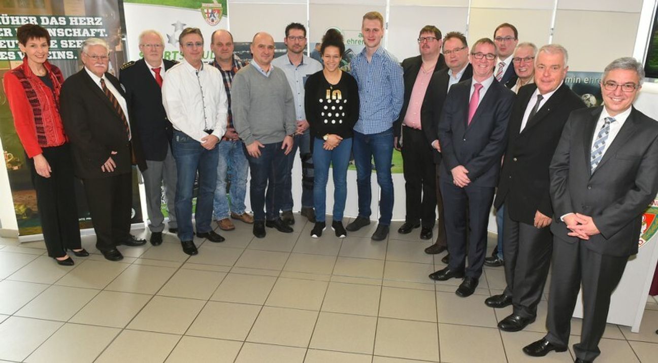 Foto Preisträger Ehrenamt: (von links) Karin Augustin (Präsidentin Landessportbund Rheinland-Pfalz, Walter Desch (Präsident Fußballverband Rheinland), Heinz-Dieter Wieß (Deutsches Rotes Kreuz Rhein-Hunsrück), Achim Wunsch (Preisträger Kreis Rhein-Lahn), Detlef Sauer ((Preisträger Kreis Westerwald-Wied), Uwe Kroll (Preisträger Kreis Rhein-Ahr), André Remy (Preisträger Kreis Westerwald-Sieg), Célia Sasic, Marius Hoffmann (Preisträger Kreis Hunsrück-Mosel), Marco Olk (Preisträger Kreis Mosel), Konrad Urmetzer (Preisträger Kreis Koblenz), Werner Gorges (Preisträger Kreis Trier-Saarburg), Jörg Ehlen (Ehrenamtsbeauftragter des Fußballverbandes Rheinland), Bernd Umbach (Preisträger Kreis Eifel), Guido Ernst (sportpolitischer Sprecher der CDU-Landtagsfraktion Rheinland-Pfalz) und Roger Lewentz (rheinland-pfälzischer Staatsminister im Ministerium des Innern, für Sport und Infrastruktur).