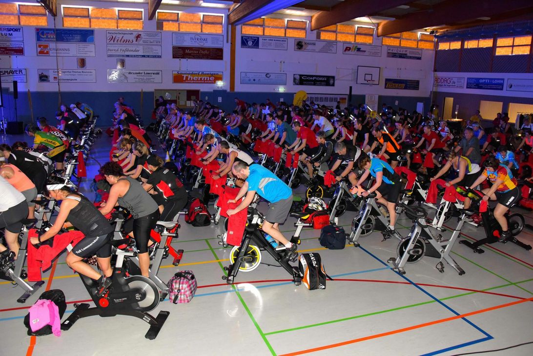 Bereits einen Tag zuvor liefen die Vorbereitungen auf Hochtouren. Die Fenster der Halle des TV Roetgen mussten zugeklebt werden, damit mit Lichtanlage und Beamershow die richtige Stimmung aufkommt, Kabel wurden verlegt, Räder gekramt, Handtücher verteilt und die Bühne für die Instruktoren aufgebaut – die gesamte TV-Cycler-Familie war auf Trapp. Gespannt empfing man ab 9:30 Uhr die ersten Sportlerinnen und Sportler und kurz darauf hieß es dann zu fetziger (und lauter) Musik: „Seid ihr da Roetgen?“. Mit Robby Meyer, Patrick Klein, Uli Behrend, Christina Gregori hatte man auswärtige Cyclergrößen verpflichtet. Ergänzt wurde das Team mit TV-Instruktoren Sandra Recchioni und Lilly Scheidtweiler, die den „Profis“ in nichts nachstanden. Verwöhnt wurden die Fahrer mit Obsthäppchen am Rad, serviert vom TV-Handballnachwuchs, ehe man sich nach getaner Arbeit am Nudelbuffet wieder mit Kohlenhydraten versorgen durfte. Bedanken möchten sich die Organisatoren bei allen Sponsoren und Helfern, ohne die ein solches Megaevent nicht durchführbar wäre. Der neue Termin für 2017 steht bereits schon fest: Das dritte Indoor Cycling Event findet am 11. März statt. Nach den Sommerferien kann man sich wieder online auf der TV Roetgen-Homepage anmelden.