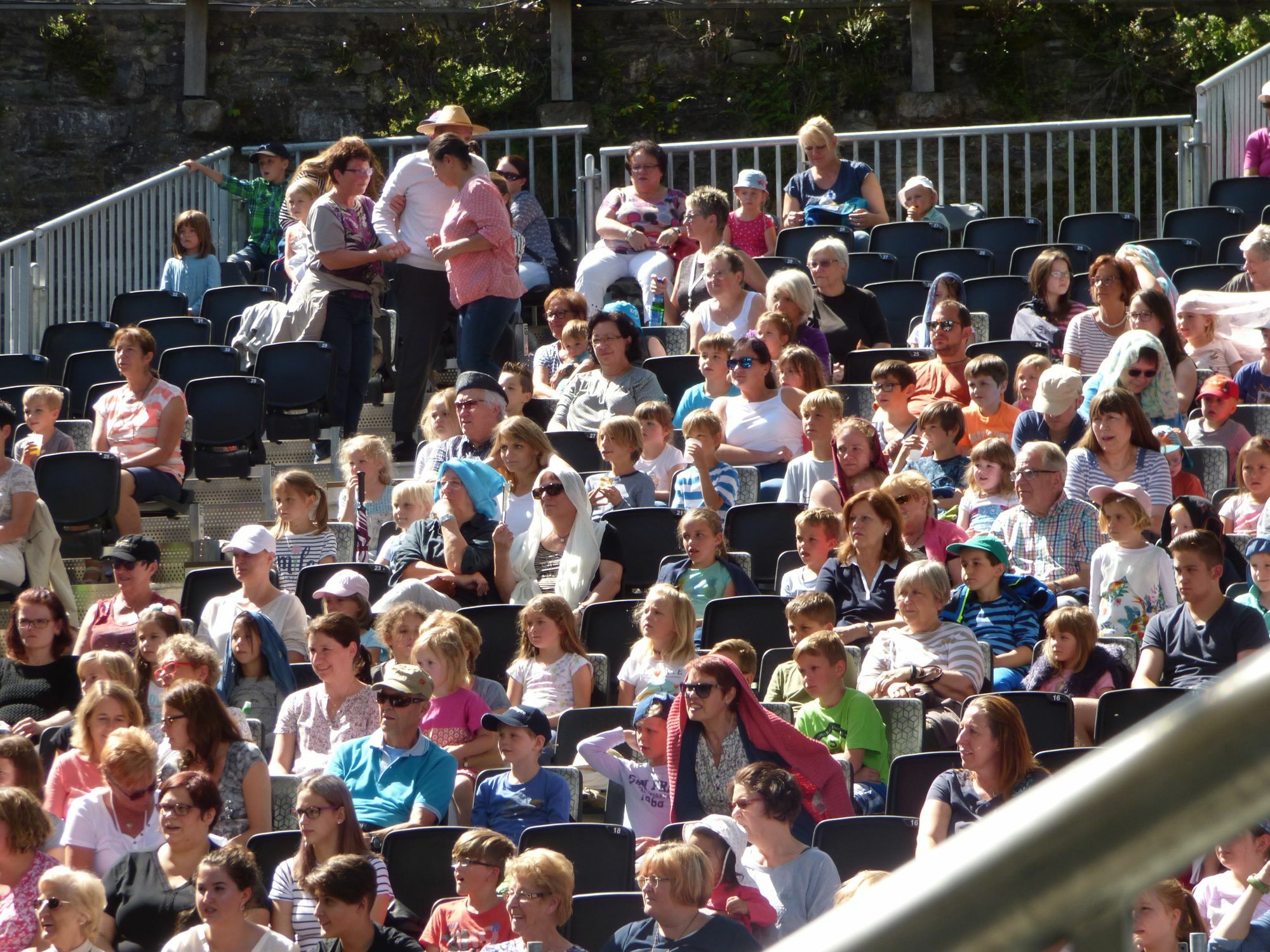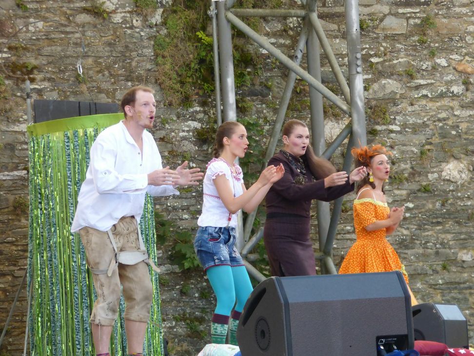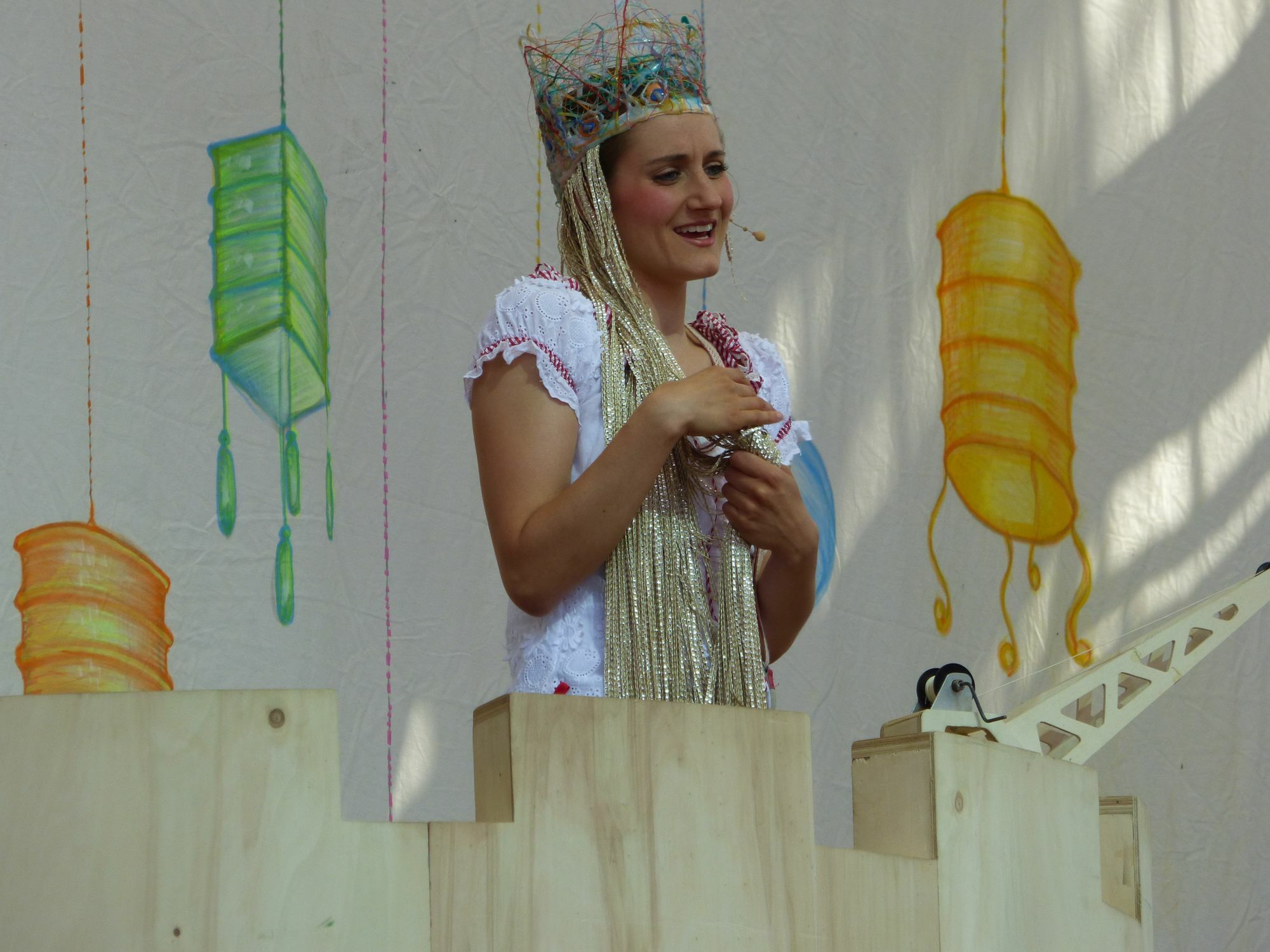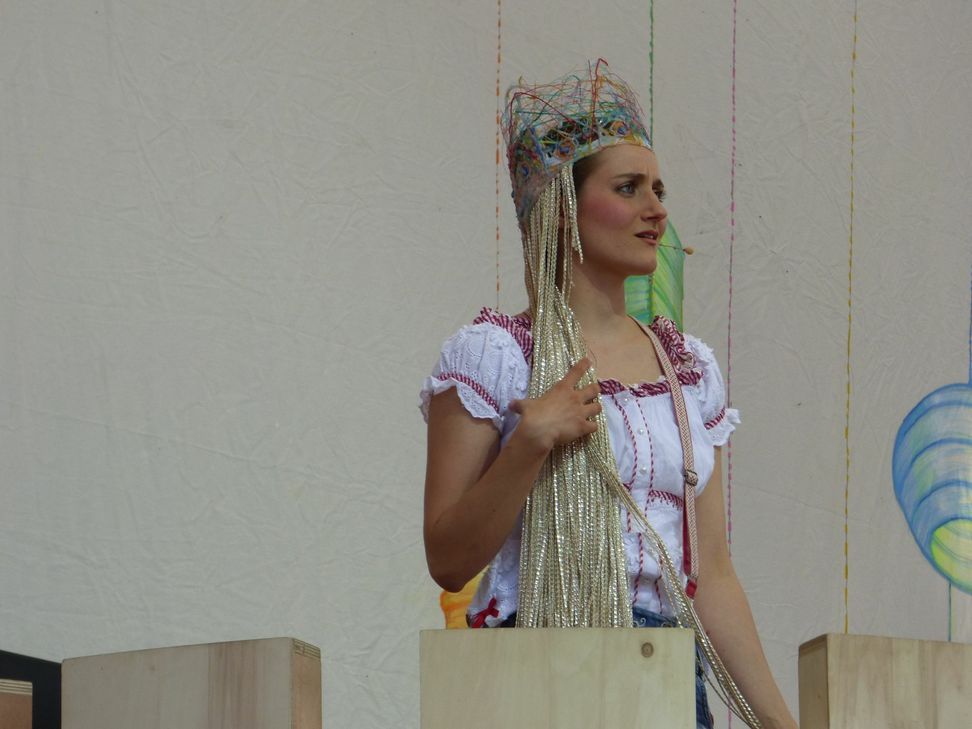 Die rund eineinviertel Stunde lange, pausenlose Aufführung hatten die Mannheimer nach ihrem bewährten Rezept gestaltet: Die ursprüngliche Geschichte wird in ein modernes Gewand gehüllt, von der Sprache wie von der Musik her. Das Deutsch der Gebrüder Grimm liegt fern; die Titelfigur und ihr Prinz rappen, ebenso die anderen Mitwirkenden. Daher gab es vom Spielwitz und vom Einsatz der Sänger her kaum etwas zu meckern. Ihre Aktionen wirkten frisch und kein bisschen aufgesetzt. Das ursprüngliche Märchen blieb erkennbar, wurde aber mit einigen Zutaten versehen. So steht zum Beispiel das krakelig gemalte Schild „Betretverbot“ auf der Bühne, auf der dann noch ein zierlicher Turm steht, von dessen Zinnen Rapunzel (Judith Devise) ihr Haar aus Kunststoff-Schnüren herunterlässt. Darüber hinaus drückte auch Daniela Grundmann, die Leiterin der Musikbühne, als grell schillernde Hexe diesem Gastspiel ihren Stempel auf. Ausgesprochen belebend prägte Clémence Leh die Produktion. Sie sang und spielte nicht nur, sondern sorgte zudem am Keyboard und – vor allem – durch den unkonventionellen Einsatz ihrer Trommelstöcke auf dem Holz des Bühnenbild-Turmes für belebende Akzente.
