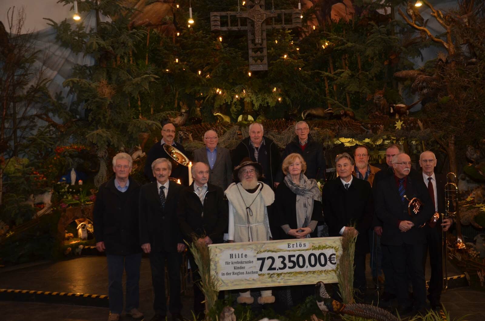 Er eilt von Auszeichnung zu Auszeichnung und von Rekord zu Rekord: Der singende Hirte, Reiner Jakbos, hat eine neue Spitzensumme in seiner Landschaftskrippe in der Höfener Kirche gesammelt.72.350 Euro spielte er in den letzten acht Wochen ein, zugunsten krebskranker Kinder im Aachener Uniklinikum. Höfen (Fö). Acht Wochen lange hatte der »Singende Hirte« wieder in seiner einzigartigen Landschaftskrippe verbracht, die Gäste mit musikalischem Programm erfreut und Gelder für krebskranke Kinder gesammelt. Wieder hatten sich viele Freunde, Helfer und Zuhörer in der gut gefüllten Höfener Pfarrkirche versammelt, um bei der stimmungsvollen Spendenübergabe dabei zu sein. Auch im bis zum letzten Blatt gefüllten Gästebuch waren wahre Lobeshymnen niedergeschrieben worden - von vielen Stammgästen, aber auch Besuchern, die die Krippe und ihren Erbauer erstmals erlebten. Man komme zur Ruhe, schwelge in Erinnerungen an liebe Verstorbene und könne zeitgleich kranken Kindern zu einem besseren Leben verhelfen, war zu lesen. »Ohne Sie wäre vieles auf unserer Station nicht denkbar«, stellte Prof. Dr. Udo Kontny, der das Geld für den Förderkreis entgegennahm, überaus dankbar fest. »Wir haben eine zentrale Monitoranlage installieren können, die die Therapie sicherer macht«, unterstreicht der Onkologe. Zusätzliches Personal werde durch den Förderkreis finanziert, damit die Schwestern sich mehr Zeit für Patienten und Angehörige nehmen können. Kontny: »Unterstützer wie Sie tun uns bei unserer Arbeit gut und motivieren unser Team immer wieder.« Knapp 800.000 Euro dürften es sein, die Reiner Jakobs in den letzten 25 Jahren gesammelt hat. Dieser dankte in seiner bescheidenen Art den zahlreichen Helfern sowie den musikalischen Begleitern und versprach, sein Engagement fortzuführen, solange es ihm möglich sei.