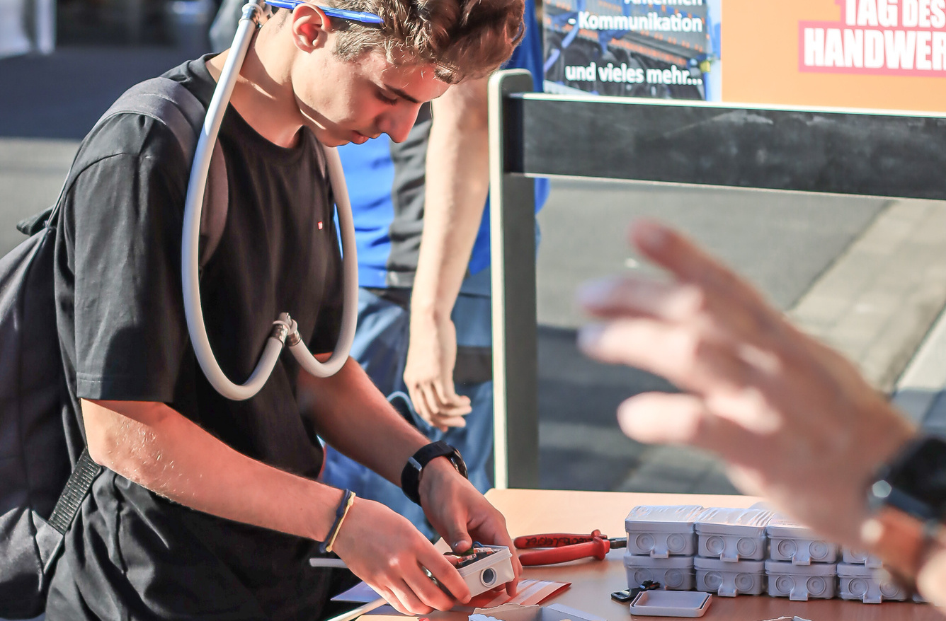 Der Tag des Handwerks, an dem bundesweit mit zahlreichen Aktionen für den Wirtschaftszweig geworben wird, fand in diesem Jahr bereits zum 13. Mal statt. Das Ziel, möglichst viele junge Menschen anzulocken, wurde im BGZ auf jeden Fall erreicht. Freude und Begeisterung bei den Besuchern konnten vor allem dadurch entfacht werden, dass sie mit richtigen Handwerkerinnen und Handwerkern sprechen, ihnen bei der Arbeit über die Schulter schauen und natürlich ganz viel selber ausprobieren konnten. So zum Beispiel auch in der Malerwerkstatt, bei den Stuckateuren oder bei den Anlagenmechanikern Sanitär-Heizung-Klima.