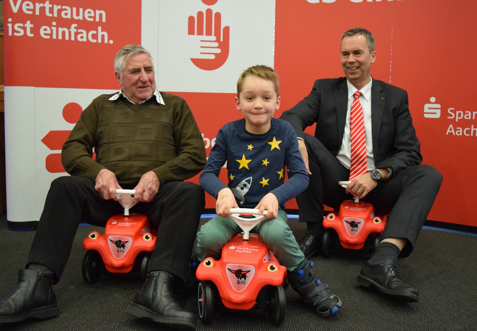 Insgesamt spendet die Sparkasse Aachen 825 Bobby-Cars an 275 Kindertagesstätten in der gesamten StädteRegion Aachen. Hintergrund ist eine Spendenaktion der Sparkasse Aachen in Zusammenarbeit mit der Verkehrswacht. »Der Kindergarten spielt eine elementare Rolle bei der Vorbereitung der Kinder auf den Straßenverkehr«, so Otto Stollenwerk, Vorsitzender der Verkehrswacht Monschau. Die Flitzeautos sollen bei der Entwicklung verkehrsrelevanter Fähigkeiten wie Wahrnehmung, Reaktionsvermögen oder Bewegungssicherheit helfen. »Denn abgesehen vom Spaßfaktor sind die Fahrzeuge auch optimale Trainingsgeräte für die Motorik«, ergänzt Andreas Kreitz.