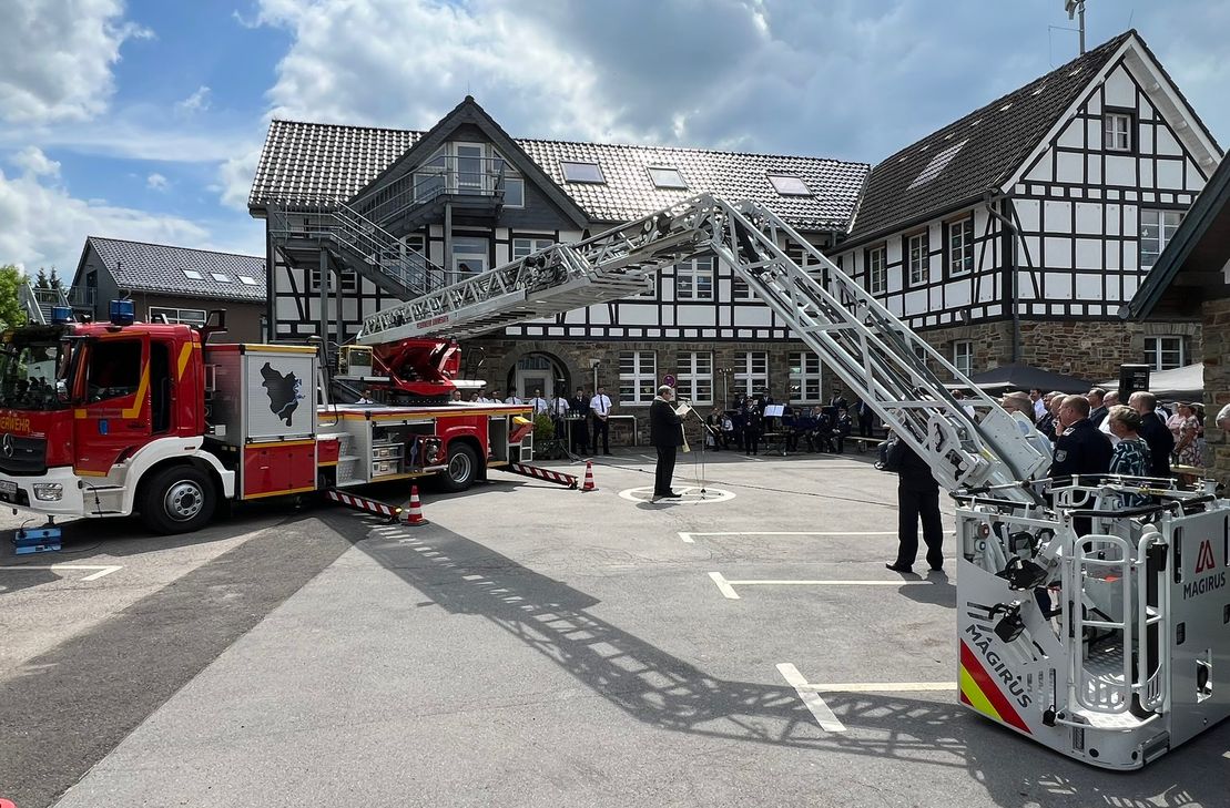 Simmerath (Fö). »Selbst die ausgediente Drehleiter sieht noch richtig gut aus.« Das befand nicht nur Pfarrer Michael Stoffels beim Anblick der beiden Hubrettungsfahrzeuge so, die vor der Simmerather Grundschule aufgebaut waren. 600 Einsätze hat sie in 27 Jahren gefahren, nach fünfjähriger Planungsphase wird sie nun ausgetauscht. Knapp 700.000 Euro hat die vollautomatische Drehleiter mit Rettungskorb die Gemeinde gekostet. »Eine sinnvolle und notwendige Investition, um die größte Wehr der Städteregion auch sehr gut auszurüsten«, unterstreicht Bernd Goffart, der der Löschgruppe Simmerath dankt, die das Fahrzeug bei Einsätzen und zu Übungszwecken nutzen wird. »250 Stunden Unterweisung haben wir bereits in das Fahrzeug investiert, 18 Drehleiter-Maschinisten ausgebildet«, erklärt Löschgruppen-Führer Dirk Pier.